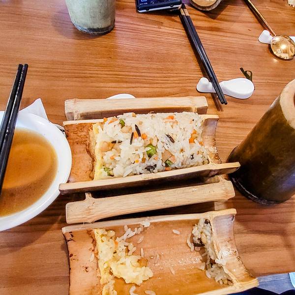 这附近不好停车,我们在边上找个了饭店吃午饭,顺理成章的免费把车停饭店门口了。吃的是竹筒饭和养生汤,饭很好吃,汤就真的。。。。 南昌 人吃不惯啊