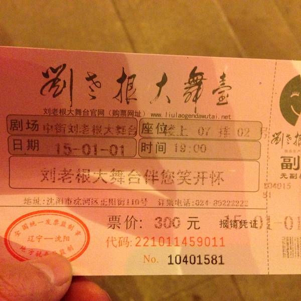 走着走着居然发现了刘老根大舞台,既来之则安之,问了一下票价,最便宜180一档居然都热销的卖光了走着走着居然发现了刘老根大舞台,既来之则安之,问了一下票价,最便宜180一档居然都热销的卖光了。剩下280的也是超过我们预算,只能遗憾,如果有下次。。。有下次也不会来沈阳呀