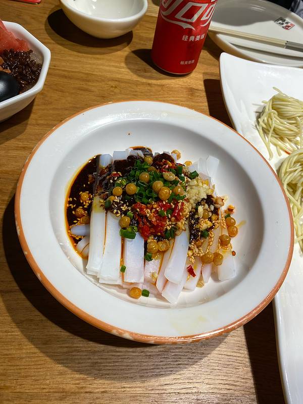虽然累了一天了,但是晚饭还是要好好吃的 其实这是人民公园店,一楼等位,二楼用餐 小排了一会儿队,人气很旺 点上了心心念念的麻婆豆腐和蒜泥白肉,真的好吃,但是最终惊艳的却是兔丁…… 兔兔辣么可爱,怎么可以不吃兔兔……蒜泥白肉川北凉粉冰粉红油兔丁麻婆豆腐