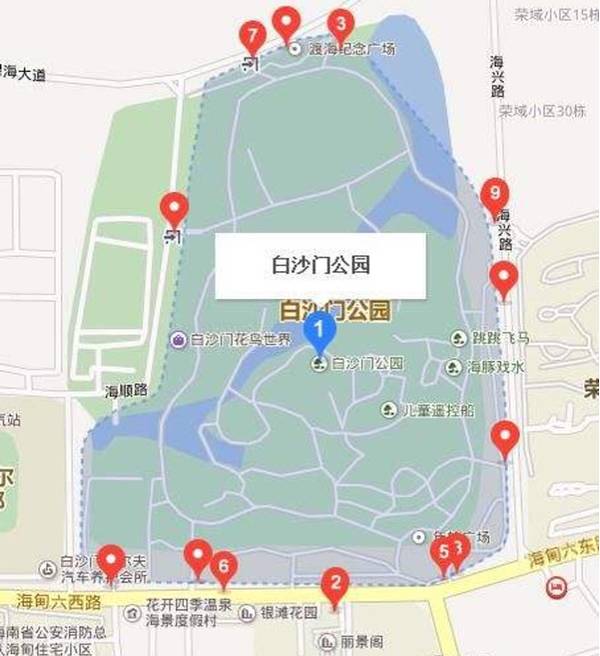 占地60公顷,于2009年元月对外开放,是 海口 市开放性休闲娱乐公园白沙 门公园位于海甸岛人民路最北端,它北依琼州海峡,南 临海 甸开发区和 海南 大学。占地60公顷,于2009年元月对外开放,是 海口 市开放性休闲娱乐公园。乘坐5、11、15、17、19、20、26、30、44路公交车都可到...白沙 门公园位于海甸岛人民路最北端,它北依琼州海峡,南 临海 甸开发区和 海南 大学。占地60公顷,于2009年元月对外开放,是 海口 市开放性休闲娱乐公园。乘坐5、11、15、17、19、20、26、30、44路公交车都可到达。公园按照规划分为: 海口 年轮、欢乐海洋、夕畔海岸、城市驿站四个主题园区。北有近千余米海滩,有渡海纪念广场,人造湖上有各类嬉戏项目,大型过山车、旋转木马等20种游玩项目供青年人潇洒。园中有纪念 海南 古代著名人物苏轼、海瑞、冼夫人等的雕塑。有餐饮小吃,收费自行车、电动车供游人们选用。 展开