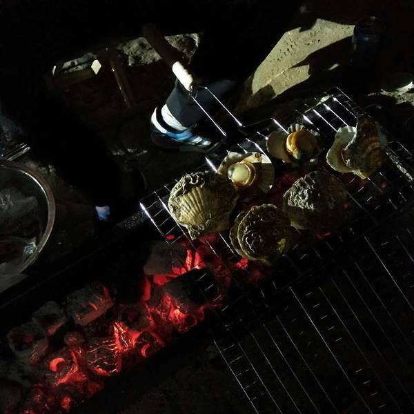 然后买好的生串和海鲜。自己带的炉子烧烤。惬意
