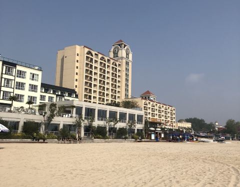嘈杂还是听到声音从海滩这个门进到了这个海景度假酒店,里面有躺椅,摇椅坐,真是爽呆了,哈哈东山浴场位于东港区,算是我在秦皇岛见得最干净最蓝最清澈的一个海滩了吧。也算是在走之前最后停留的一个海滩,真的很美。