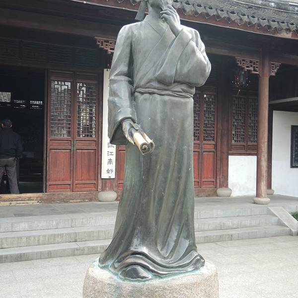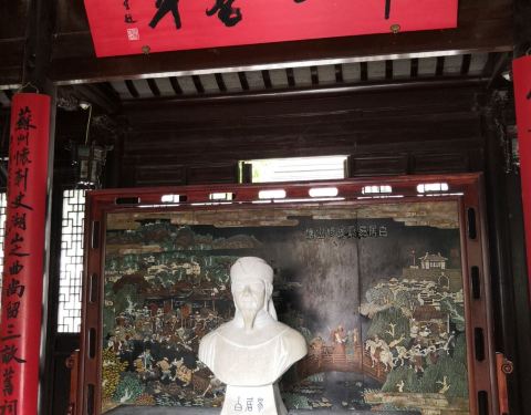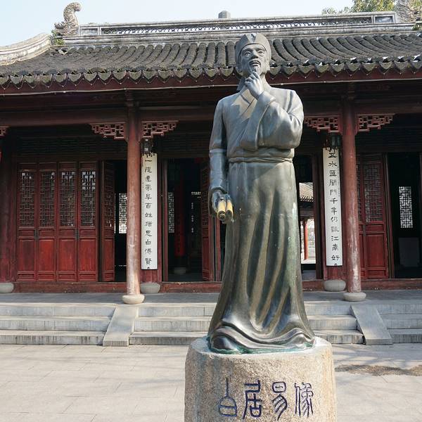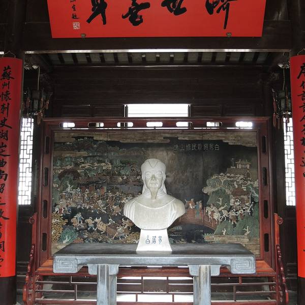 就是唐代大诗人白居易纪念馆,正门墙上写着山塘始祖,乐府诗神八个大字,进门是白居易的石雕像,穿过...