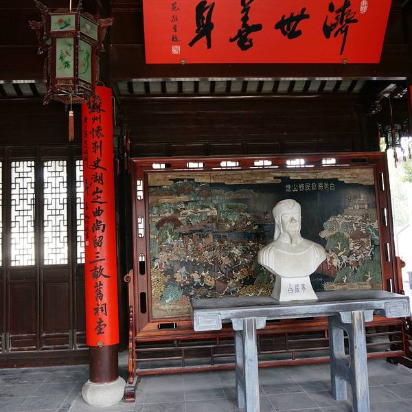 看来为官一心为民,人民会永远怀念他的。阖闾城碧铺秋草,乌鹊桥红带夕阳白居易曾经担任过苏州刺史,为了方便苏州人民去虎丘方便,疏通了山塘河,就是现在所说的七里山塘到虎丘,为官给人民办了好事,百姓就为了纪念白居易,就建了这个白公祠,馆不大,前院就是白居易全身塑像,身后的...白居易曾经担任过苏州刺史,为了方便苏州人民去虎丘方便,疏通了山塘河,就是现在所说的七里山塘到虎丘,为官给人民办了好事,百姓就为了纪念白居易,就建了这个白公祠,馆不大,前院就是白居易全身塑像,身后的大门两边是一副对联:五水汇阊门千年仍咏江南好 一堤连虎阜百姓犹思白傅贤。主厅堂是白居易的汉白玉半身像,像后屏风是白居易与民众修山塘河的漆画,屏风背后是白居易的“登闾门闲望”:阊门四望郁苍苍,始觉州雄土俗强。十万夫家供课税, 五千子弟守封疆。阖闾城碧铺秋草,乌鹊桥红带夕阳。 处处楼前飘管吹,家家门外泊舟航。云埋虎寺山藏色, 月耀娃宫水放光。曾赏钱唐嫌茂苑,今来未敢苦夸张。看来为官一心为民,人民会永远怀念他的。 展开