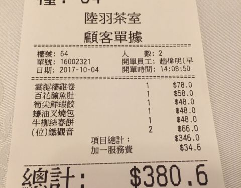 老店了,前几次路过都是吃饱吃不下的状态,这次特地来的,老店老情怀,可是味道却很一般,比莲香楼好点,但是不如添好运呀。 看到店员和一位婆婆年纪的在聊天,估计老婆婆常来吃的。 10[%]的服务费,滑鸡球大包售完没吃上。 百花酿鱼肚 58港币,云腿糯鸡卷 78港币,笋尖鲜虾饺 48港币,蚝油叉烧包 48港币,牛柳丝春饼 48港币。百花酿鱼肚在点的里面算好吃的了,虾饺皮有点厚,,叉烧包不如添好运的,牛柳丝春饼的春饼皮是不脆的,也不热。 茶水选了铁观音 33港币一位,两位66港币,总共380.6港币。