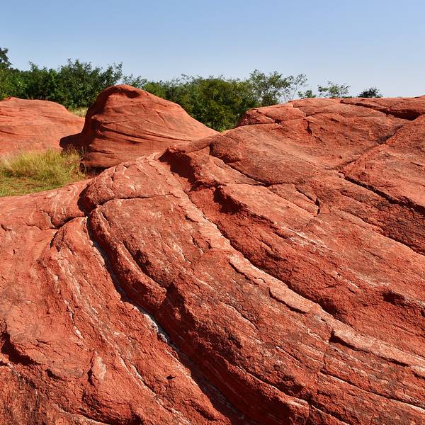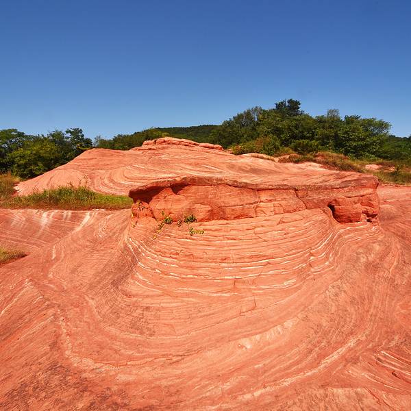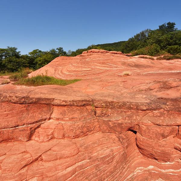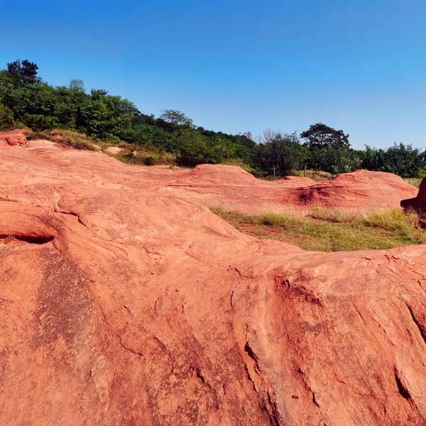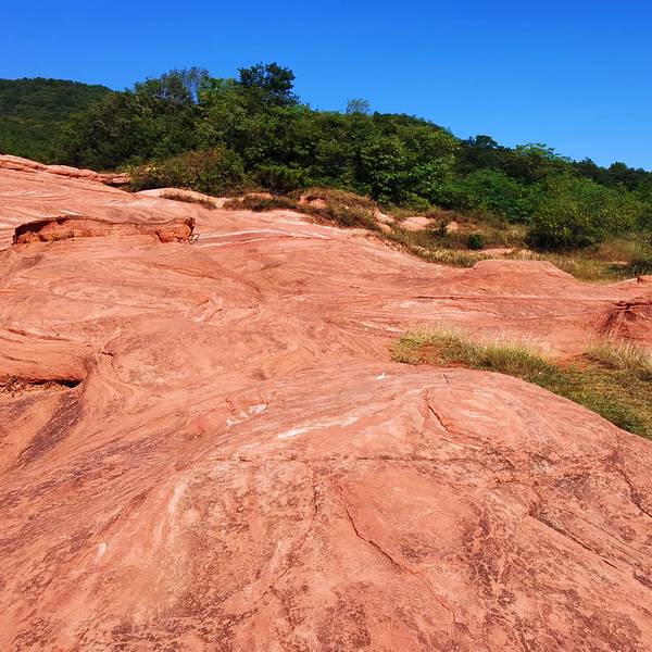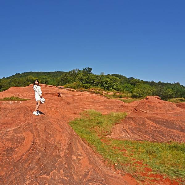 自驾来到定远县大横山南麓,去看这一处地质奇观。只见山坡上的岩石呈现出火红的色彩。亿万年沧海桑田的地质变迁加上流水和风的侵蚀,给这片山石刻画出一道道时光与岁月的痕迹。由砂砾岩构成的丹霞地貌在华东非常...