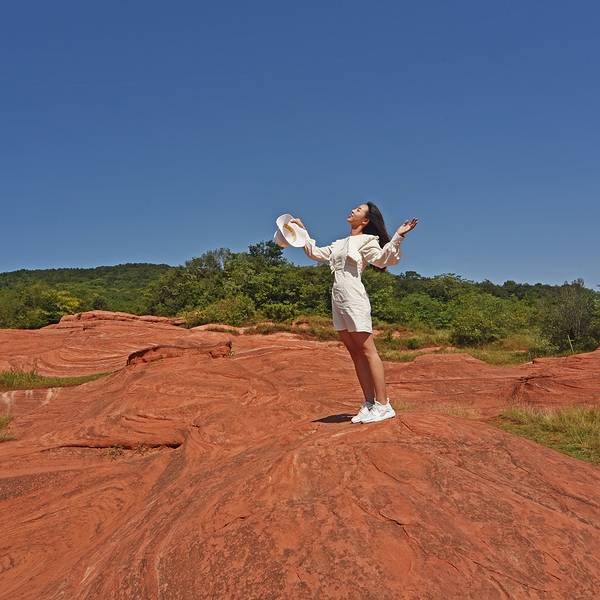 自驾来到定远县大横山南麓,去看这一处地质奇观。只见山坡上的岩石呈现出火红的色彩。亿万年沧海桑田的地质变迁加上流水和风的侵蚀,给这片山石刻画出一道道时光与岁月的痕迹。由砂砾岩构成的丹霞地貌在华东非常罕见,在安徽和江淮地区则是独一无二的景观。红石峡丹霞地貌占地约2平方公里,赭红的色彩和波浪般优美的纹理线条,让这成为上佳的拍照取景地,不需要特别的滤镜,也能拍出美美的照片。如今红石峡的美照已经在网上传播开来,成为定远县一处网红景点,尤其吸引自驾的游人前来打卡。