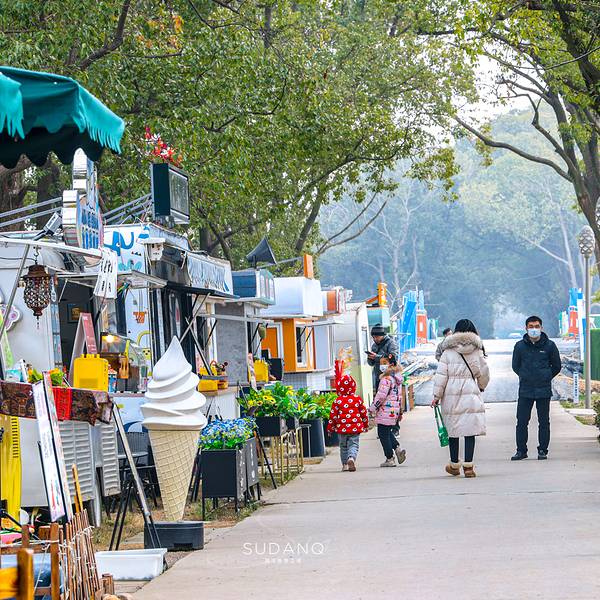 吴江市区难得的城市绿肺,一片茂密的森林,目前逐步在打造成一个融吃喝玩乐于一体的慢生活聚集地。店铺载体以集装箱和房车为主,经常会有独立歌手街唱,调性拉满。周末乐队现场表演,氛围非常好。临时入口进去会看见一节绿皮火车,特别复古怀旧,车厢内部是一家餐厅,逛累了坐在车厢里点几个小菜,似乎时光一下子回到了上个世纪。无论商铺还是森林随意摆个pose都非常出片,无敌打卡胜地。