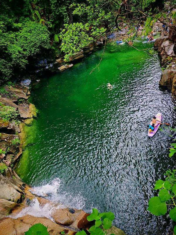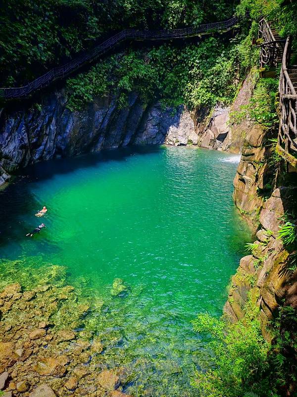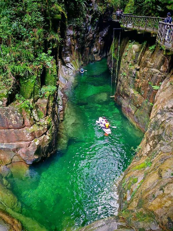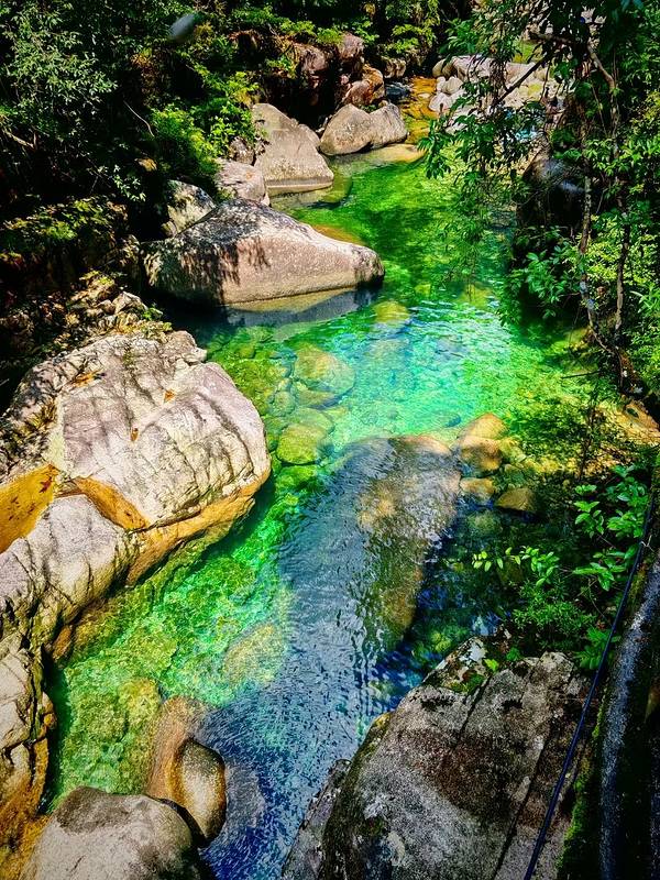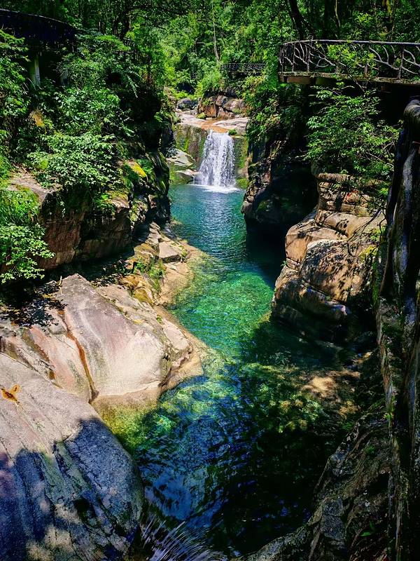 桂林龙潭江的果冻水,真的美到如其名!藏在猫儿山南麓的青山间,一汪汪潭水澄澈似琉璃,碧绿如翡翠,通透的质感像凝固的果冻,水底鹅卵石与水草清晰可见。阳光洒落,波光粼粼的水面晃着细碎金光,深浅不一的水潭沿峡谷错落,龙潭飞瀑下的碧潭更是将这份剔透美推到极致。 两岸青山叠翠,栈道绕水而行,微凉的山风裹着水汽,踩进清冽的浅滩,指尖触到温润的“果冻水”,夏日燥热瞬间消散。这抹独属于龙潭江的清透绿意,是桂林山水藏起来的清凉惊喜,随手一拍都是治愈系山水大片。