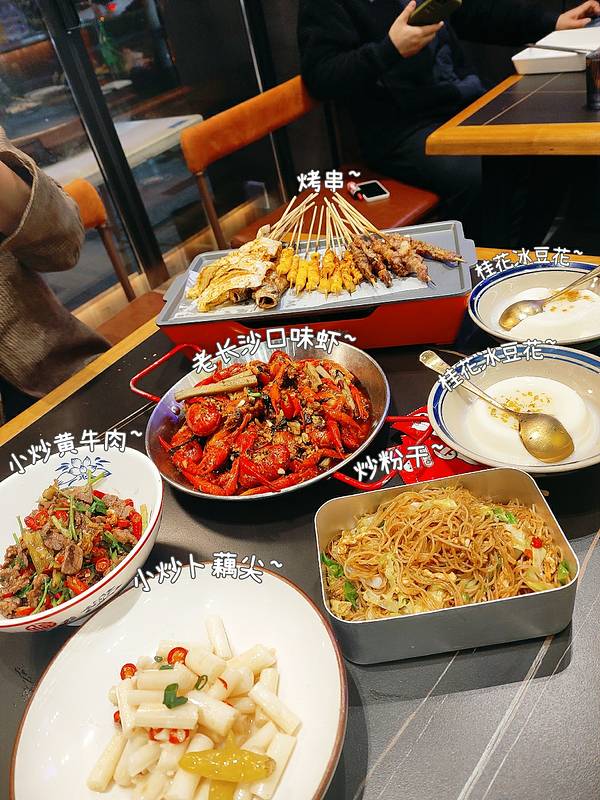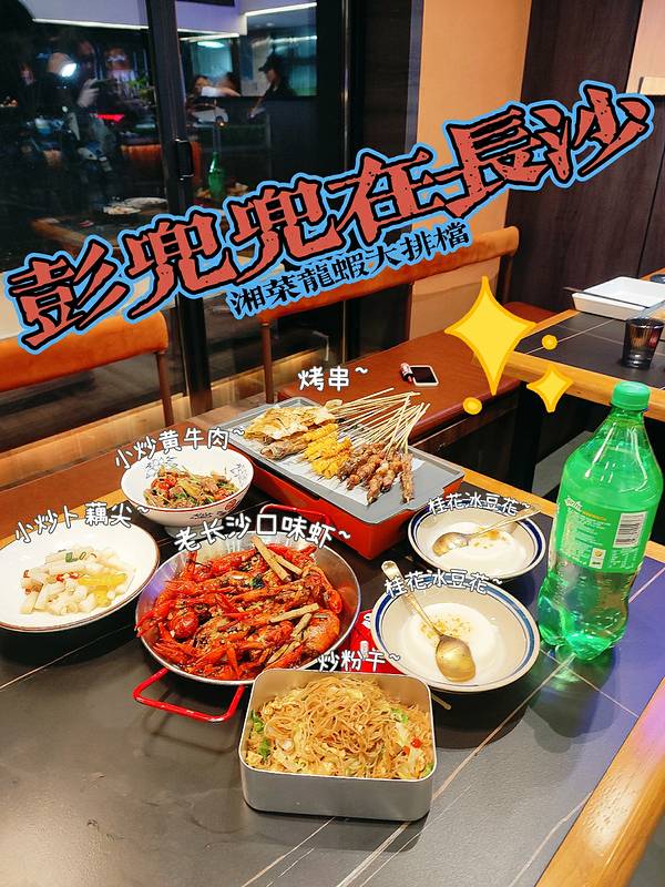 在网红夜宵倍出的未来科技城,老纪豪宅,老杨烤小黄鱼都是夜宵届的顶流,最近开了一家主打口味虾的湖南夜宵馆彭兜兜在长沙! 【菜品】 老长沙口味虾:在长沙每到小龙虾季节基本口味虾是一道必点菜,也成了长沙的名菜,整体口味属于蒜香香辣口味,里面加了紫苏增加了特别的香味,还加了藕条脆爽开胃,可以点一份干捞面拌着吃也不错! 小炒黄牛肉:牛肉很嫩,因为加了剁椒,泡椒,蒜末,姜末。酸辣开胃其中香菜更让菜品升华,下饭绝配! 小炒卜藕尖:第一次吃热炒的酸辣藕尖,还加了蒜末更加爽口! 烤串:都说长沙都烤串是刺客,他家的串量还是正常的,味道也还行! 炒粉干:里面好像就放了一点包菜,实在是素了一点,还是浙江温州或者衢州的炒粉干好吃! 豆花:今年很流行,几乎火锅店,川菜湘菜馆子都会有,可以起到解辣的效果! 环境:楼下是散桌,楼上有包厢,饭点基本需要等位! 服务:态度还不错,出菜稍微有点慢!