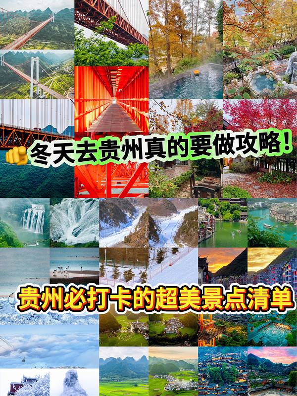 冬天去贵州,必打卡的超美景点清单!🏞️✨ 冬天的贵州,既有温暖的阳光,又有迷人的自然风光,绝对是放松和享受的好地方!下面这些景点,不仅好玩,还能让你感受得到贵州独特的韵味,姐妹们准备好了吗?🐎 1. 石阡温泉 这里是拥有400多年历史的国家4A级温泉,拥有138个泡池,简直就是泡汤爱好者的圣地!冬天最好的享受就是在温暖的泉水中放松身心,感受那份暖意直达心底🧖♀️♨️。 2. 梵净山 在这里,你能够感受到一种幻想般的仙境。冬季的梵净山更是神秘,云海与雪景在这里交融,仿佛走入了动漫世界,非常适合拍照哦!🤩 3. 镇远古镇 这个有着两千年历史的古镇冬天尤其宁静,适合徒步探险。这里有中国四大悬空寺,你可以夜游舞阳河,无论是拍照还是闲逛,都能感受到浓厚的历史气息📷。 4. 梅花山国际滑雪场 在西南最大的滑雪场,甚至新手也能尽情享受滑雪的快感!940米最长的雪道让你挑战一次不够,快来解锁这项冬季运动吧🏂❄️。 5. 黄果树瀑布 作为亚洲第一大瀑布,冬天的人流相对较少,让你可以悠闲地欣赏这股壮丽的水势。记得提前关注景区公众号,有些区域可能会修缮哦!🛤️ 6. 坝陵河大桥 这座超级工程在冬季云雾缭绕下显得尤为神秘,似乎悬在空中。你可以在步行栈道上近距离感受那份壮阔,拍出的照片绝对美丽至极🌉。 7. 威宁草海 这里是冬季候鸟的天堂,尤其是黑颈鹤,被称为“会飞的大熊猫”。在夕阳下,湖面波光粼粼,安静的草海村如同小威海般宁谧🐦☀️。 8. 西江千户苗寨 这是世界上最大的苗族村落,冬天喧嚣退去,更显得亲民。穿上苗服拍照,夜晚的灯光让这里别有一番风味,无路人打扰,尽享宁静美好!🛖✨ 9. 万峰林 如果你在1-3月间来,正好能看到八十万亩油菜花盛开,骑行在花海中,仿佛提前迎接春天,真的超治愈⛰️🌼。 10. 乌江寨 这满是贵州传统吊脚楼的地方,夜景宛如《千与千寻》的场景,别有一番风情!你还有机会体验布染、摇橹船,晚上热闹的篝火晚会让你感受到当地方言与传统文化的魅力!🌌🔥 这个冬季,贵州等着你去探秘,那些美景绝对不会让你失望!❤️