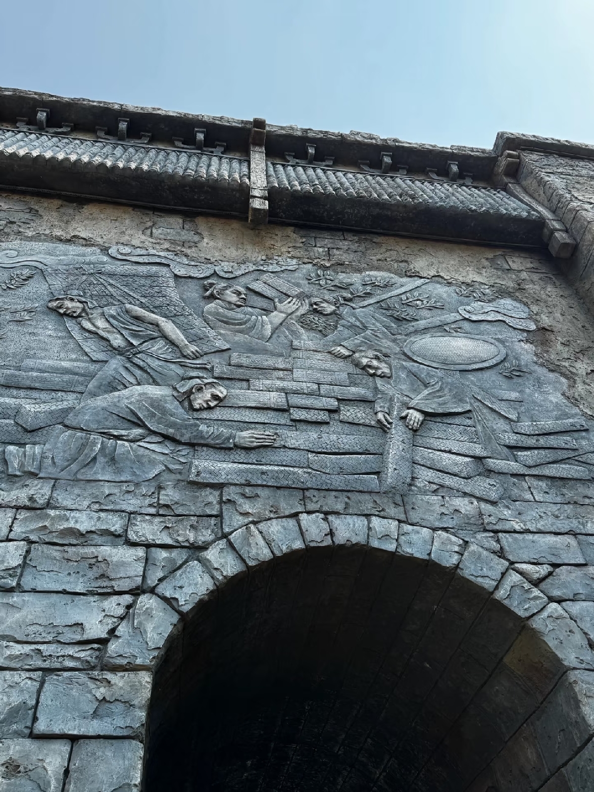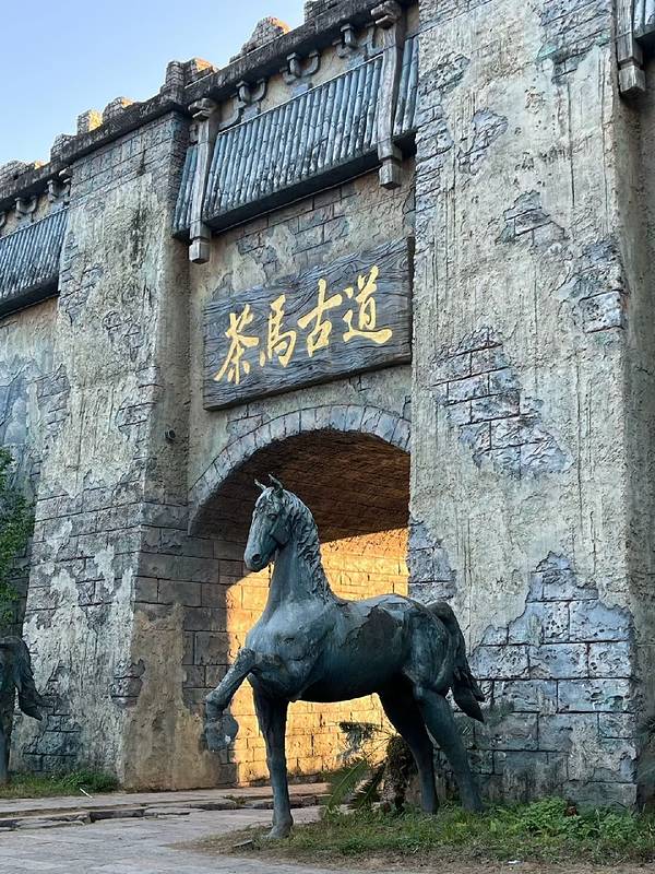 刚踏入景区,仿古城墙式的大门就瞬间拉满氛围感。斑驳做旧的石墙纹理粗糙,仿佛历经百年风雨,鎏金的“茶马古道”四个大字苍劲有力,门前昂首挺立的青铜骏马雕塑栩栩如生,肌肉线条分明,前蹄扬起,仿佛下一秒就要踏响山间的铜铃。城墙侧面的浮雕更是细节拉满:马帮伙计们肩扛茶砖、修整道路、交易货物的场景被刻画得入木三分,人物的神态、动作都鲜活生动,每一道纹路都在诉说着当年的故事。穿过城门,便是真正的古驿道:由青石板铺就的山路蜿蜒穿梭在茂密的热带雨林中,被马蹄和脚步反复打磨了数百年的石板,光滑锃亮,深浅不一的马蹄印清晰可见,仿佛还残留着当年的温度。阳光透过层层叠叠的树叶,在石板路上洒下斑驳的光影,耳边只有风吹树叶的沙沙声和鸟鸣,恍惚间,仿佛能听见马帮的铜铃声从远处的山林间悠悠传来。