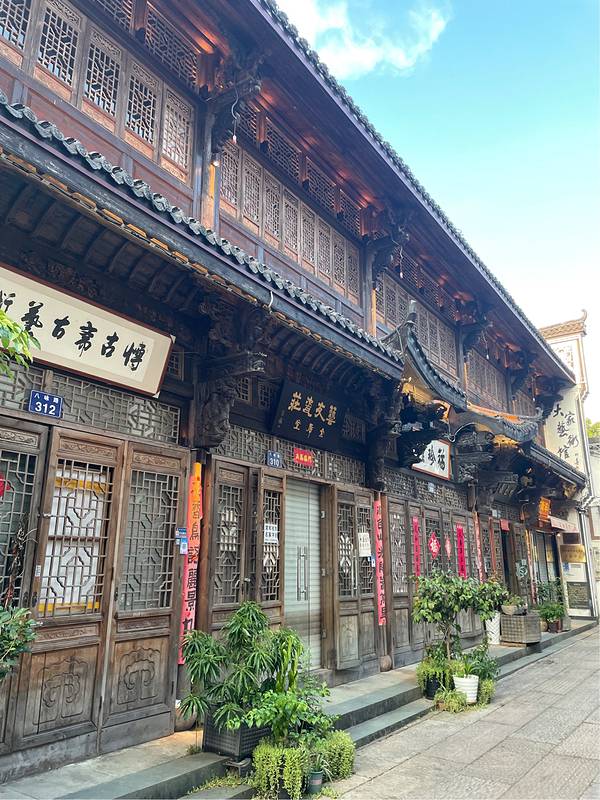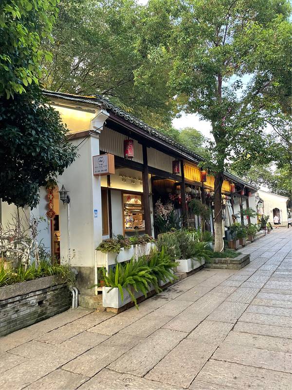 这是一条颇具历史年代的老街。街道两侧都是白墙黛瓦的两层楼阁,一楼商铺,二楼可以住人。这里的商铺大都是做古玩生意的,所以很多人也称这里为古玩街。街道两侧还有不少盆栽,绿油油的,增添了许多色彩。
