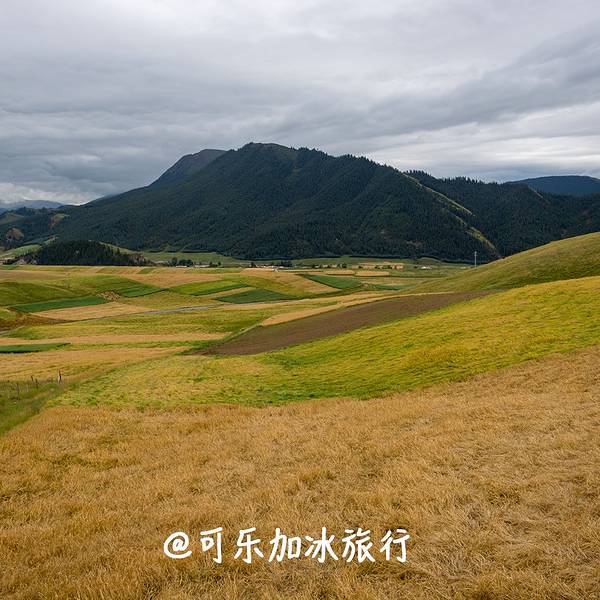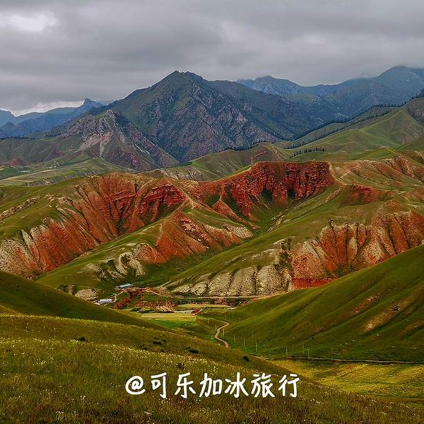 碧绿草原与火红地貌辉映,隔河观赏巍峨雪山,是摄影师们的最爱。