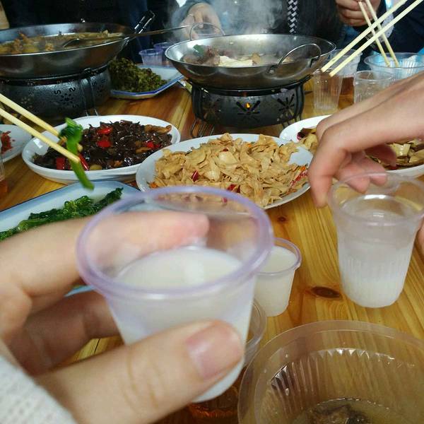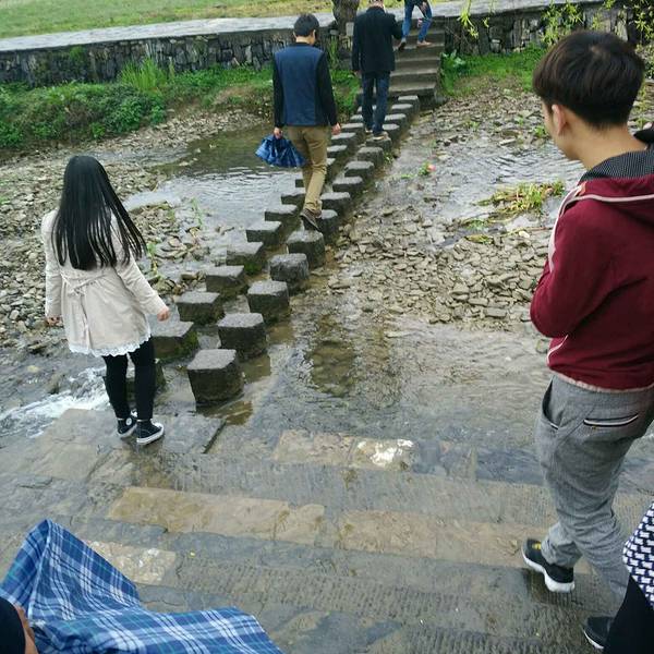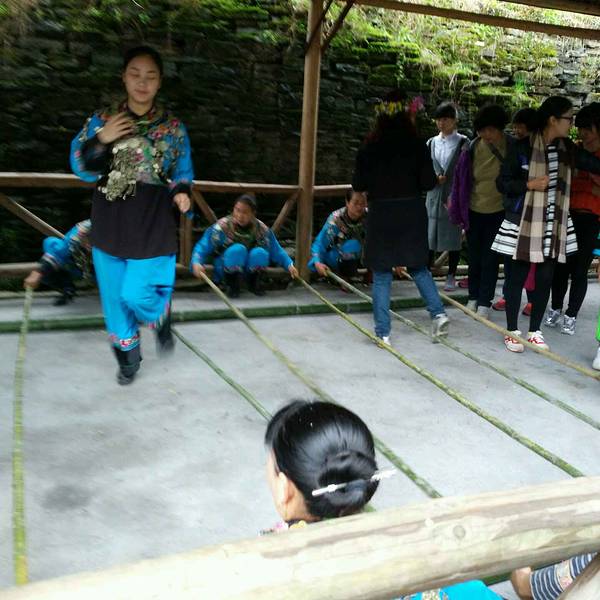 这就是导游在车上介绍的特别值得纪念的苗家饭!讲解得挺不错,车内气氛非常好!小小跳岩让她们玩得挺开心客栈阿姨推荐的路线,没事的可以过去玩玩,他们会随机组团,是个认识朋友的机会!只是我们人太多,没人前来搭讪!😞进苗寨之前导游会教大家唱山歌,进苗寨之前有三卡,卡歌,卡酒,卡饭!