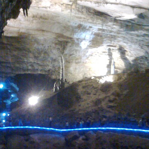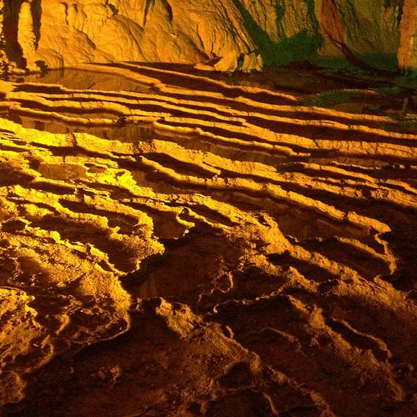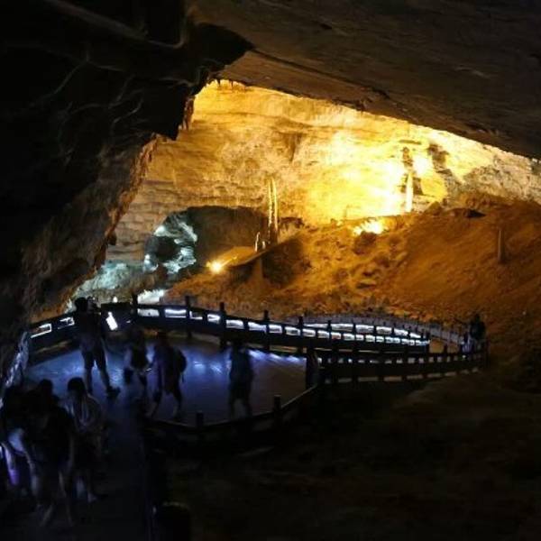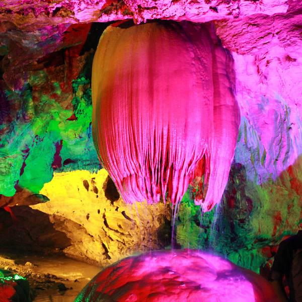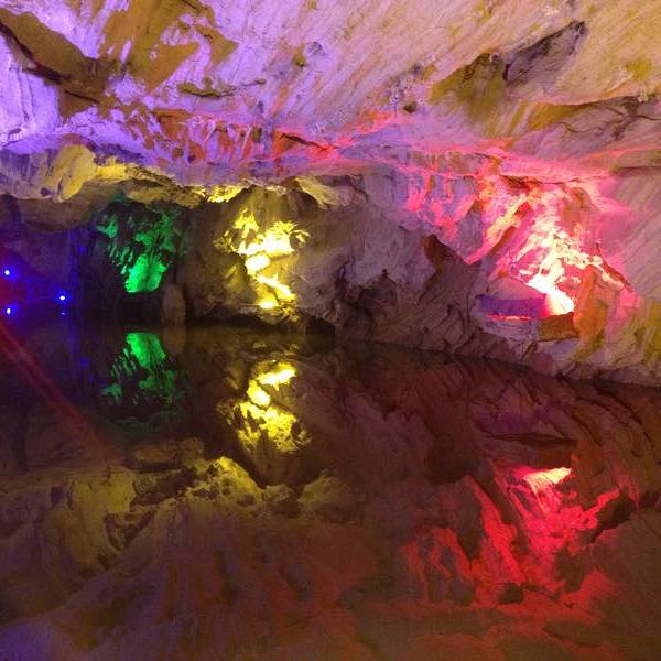 洞中有古战场,还有绿油油的田园和令人毛骨悚然的黑暗蝙蝠。 坐船游荡在洞中的小溪中,四周的怪石在灯光的承托下,显得光怪陆离。