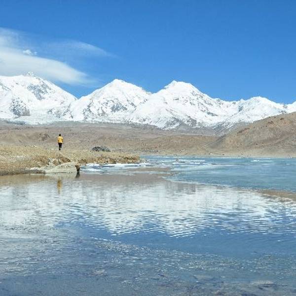 放眼望去,白雪皑皑的山峰夹带着伸向雪线下的道道冰川,在阳光的照射下,反射着银光。同行的许多小伙伴都是第一次近距离欣赏到雪山冰川,激动的心情溢于言表,有的跪拜在她的脚下,有的对着她高呼我来了,好让冰川公主看他一眼吧!当然,就是少不了各种姿势的拍照!据说慕士塔格峰是很多登山爱好者的圣山,也是许多初级登山爱好者的实习课堂,因为她很包容友好,难度相对较小,也很少有意外事故发生!所以常年都有来自海内外的登山爱好者来这里挑战自我,体验登山的乐趣!包车的师傅可能心疼他的车吧,未到登山大本营就不肯再往前走了。当然,那个位置欣赏冰川雪峰已经很棒了,大家也没有真正登山的能力与装备。也许以后有机会再次专门为她而来吧!冰山的西部坡势比较平缓,酷似一个雪白的大馒头,云雾就是太阳照射下散发出的蒸汽,云雾增添了她的神秘与圣洁。从冰川公园门口沿314过道下行不到10公里,就来到卡拉库里湖,系列雪山包裹着圣湖,清澈见底,在阳光中湖水闪着银光发光,镶嵌在雪峰下面,倒映着雪峰,山水圣湖相映成趣,美轮美奂。实用贴士: