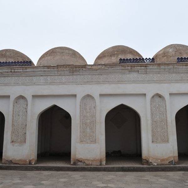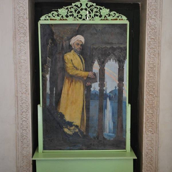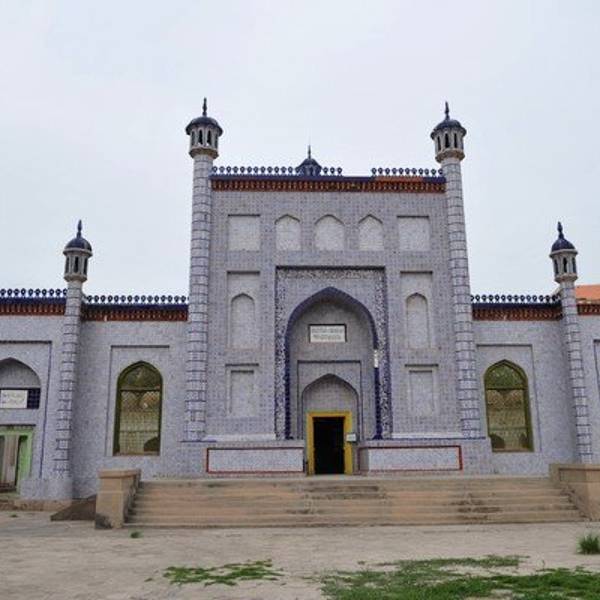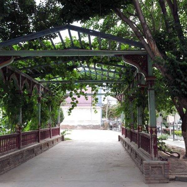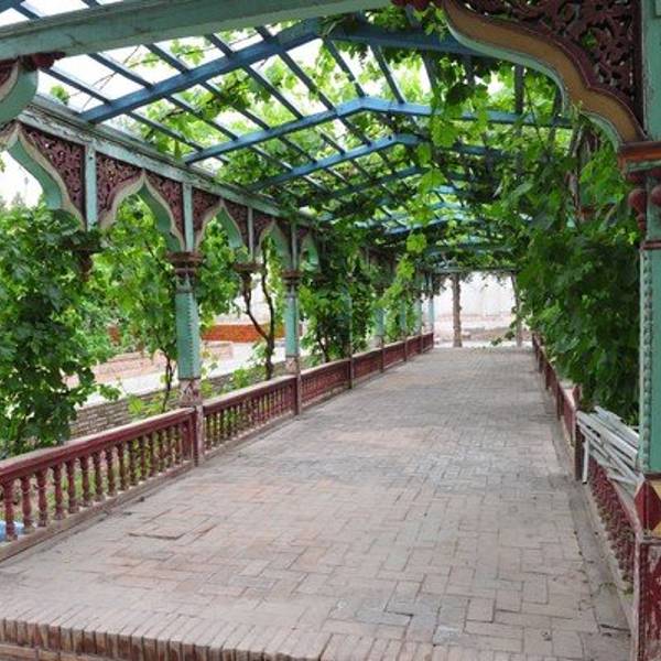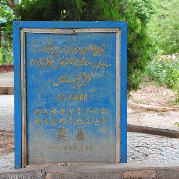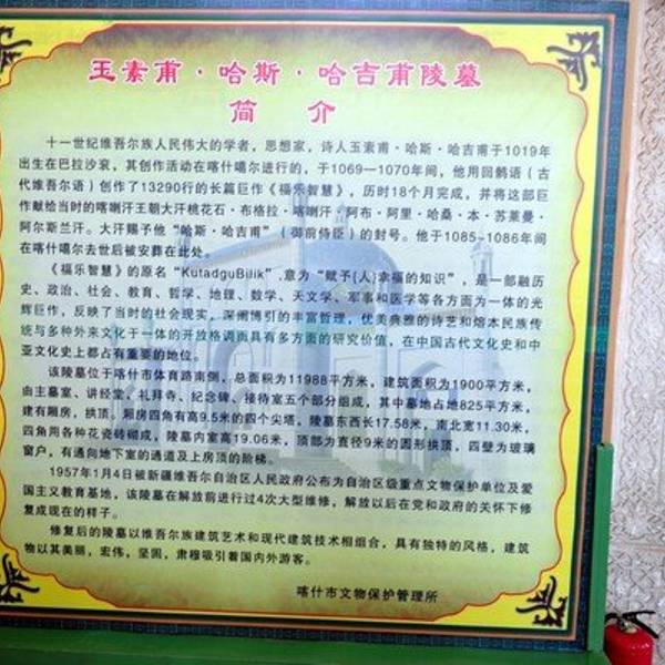 玉素甫·哈斯哈吉甫墓,座落在喀什市体育路十二小学院内,占地965平方米。玉素甫.哈斯哈吉甫墓是一组富于维吾尔传统建筑艺术特色的建筑群。陵园正门朝南,园内除中心庭院外,可分东、西两大部分,西部有一个平面呈曲尺状、顶为大跨度石砌圆拱顶的礼拜殿,前有雕花密肋天棚,后有祈祷室;东部是玉素甫.哈斯哈吉甫的陵墓所在,前有宽8米、高9米、纵深3米多的巨大门楼),其后是主墓室,为外方内圆的弯顶建筑,顶部正中有一小塔楼,从地面至塔顶通高11米多。室内地面正中央,用彩色琉璃砖贴面的墓包之下,便是这位伟大诗人的长眠之地。