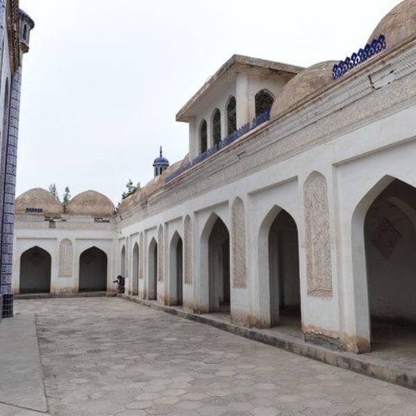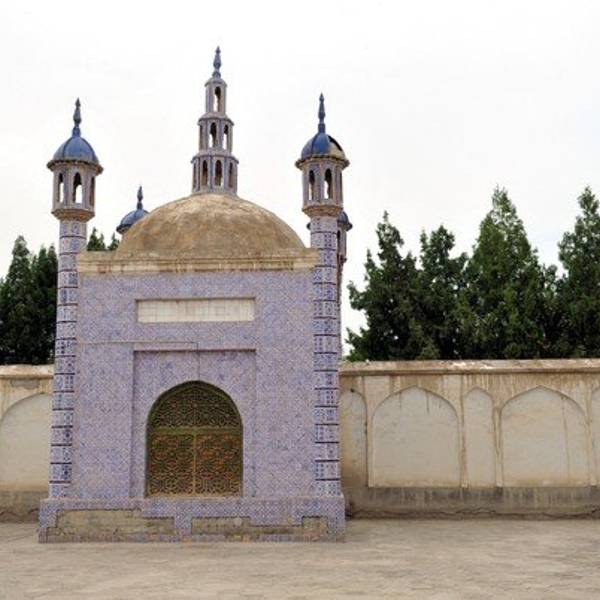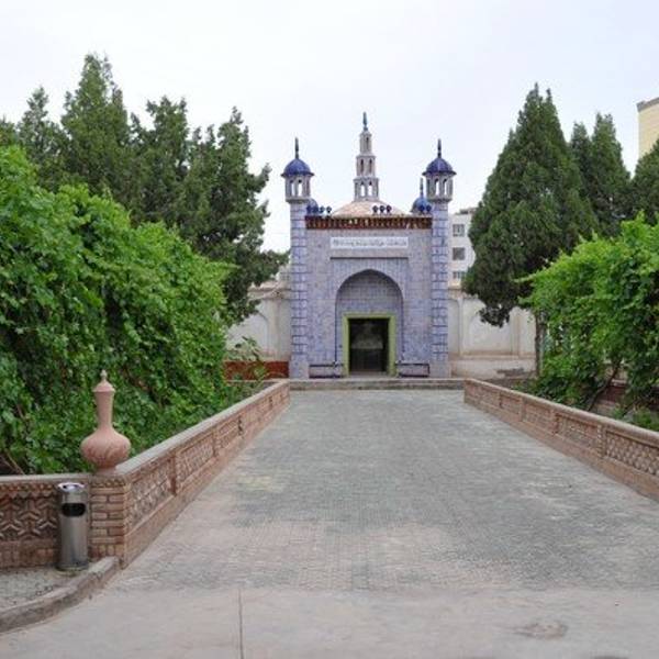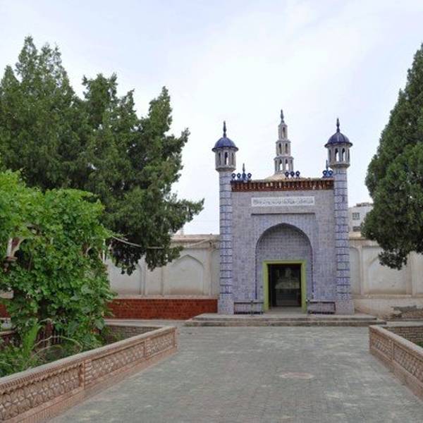 礼拜殿为平顶,主墓室是绿琉璃圆顶;而且其东部建筑中所用塔楼(邦克楼)甚多,约10余座,为新疆同类建筑中少见;塔楼的制作精美可观,也是建筑装饰。整个建筑群高低相间,主次分明,形成一完整的群体。墓室外墙以蓝底白花琉璃砖贴面,礼拜殿木柱的雕刻花纹古拙奇特,纹样丰美,与一般制作方法不同,都是新疆伊斯兰建筑中难得的精品,为后世所罕见,体现出古代维吾尔工匠的高超技艺和杰出才能。