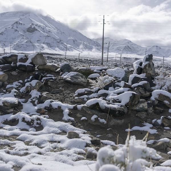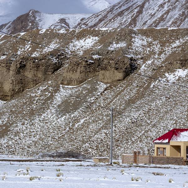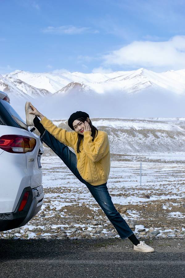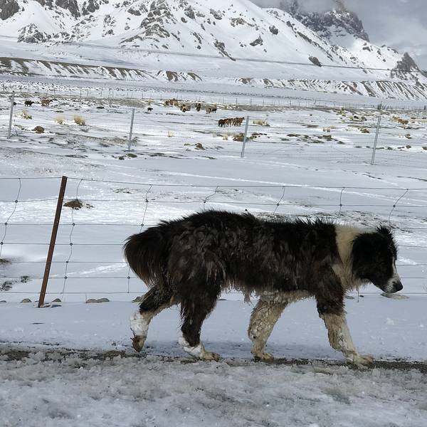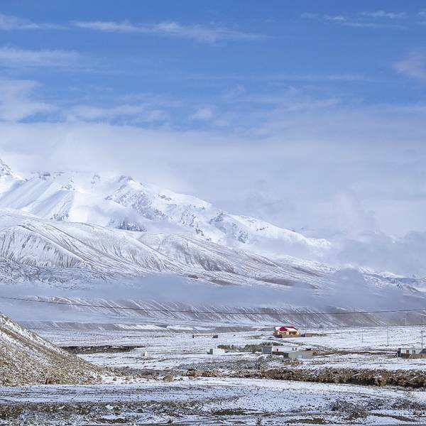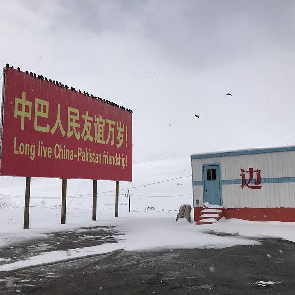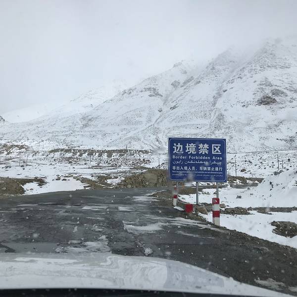 路对面的树上还积压着昨夜的大雪 (原谅我们没擦干净的挡风玻璃)塔县到红其拉甫国门还有120公里。往红其拉甫开,绿地以肉眼可见的速度被雪白吞噬。冰山近在咫尺,仿佛一轰油门就会冲进这一望无际的雪白里。我见多好多次雪山,却一次又一次的错过下雪。心里有一块小小的遗憾。“我脚下的路,恰从这世界正中间通过,像是天地大梦中唯一清醒的事物。我稳当当地走在路上。这里是大陆的腹心,是地球上离大海最遥远的地方。 亚洲 和 欧洲 在这里相遇,这是东方的西方,西方的东方。”——李娟《我的 阿勒泰 》“万山堆积雪,积雪压万山。”大哥抓起一团雪,趁我没有防备想悄悄塞到我毛衣的领口。我可不能输,抓起更大的一团用力扔向他,可是我的准头不好,很快就败下阵来。车子刚开到哨所门前,纷纷扬扬的大雪就撒下来了。我手忙脚乱的披上冲锋衣,打算和边防战士说明来意,嘴才张开就听到战士说:“这里不准停车,赶紧开走!”我像个泄气的气球:“我们想去看看国门……”“现在不开放,快把车开走”凶巴巴的兵哥哥把我之前想好的说辞全都塞了回去。。 yes……sir…… 😭😭气温太低,路面结了一层厚厚的冰。稍有不慎车子就可能会打滑被边防战士拒绝的沮丧还没完全褪去,车窗外是连绵不断的群山和渐行渐远的“中巴人民 友谊 万岁”。冰天雪地里居然有一个人在向我们挥手,大哥慢慢把车停靠在路边。我把车窗降下来向后看,那个人一路小跑过来,周围一片寂静,他的鞋子踩在雪上发出咯吱咯吱的声响,我以为他是要搭便车的牧民,赶紧爬向后座把没吃完的零食捡进塑料袋子里。