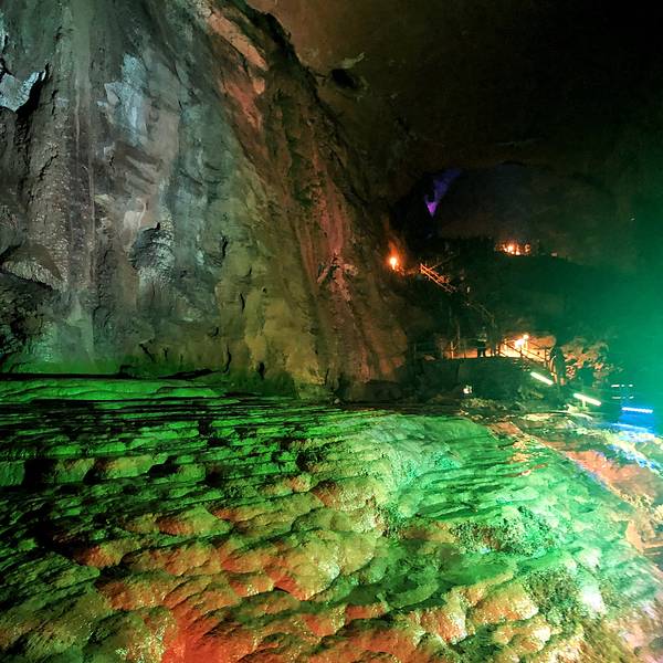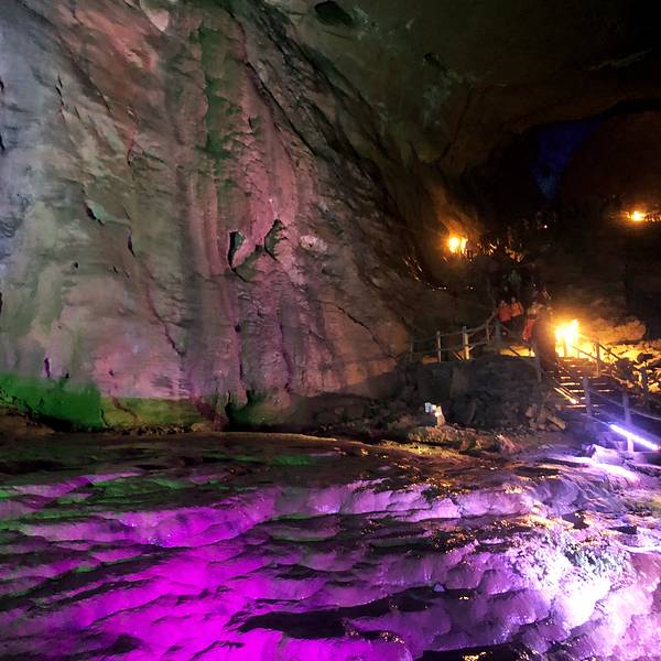 后洞的灯光绚丽,完全是天堂仙境。我是8.23号下午1点冒雨前去的,一进大门,饿龙吞江瀑布太震撼了正值暑期,来腾龙洞旅游的人多。主要表现在看激光舞和土家表演的时候,连位置都坐不到。我是8.23号下午1点冒雨前去的,一进大门,饿龙吞江瀑布太震撼了!路过官材石,到达主洞大门,确实是天下第一洞。因为下午的...正值暑期,来腾龙洞旅游的人多。主要表现在看激光舞和土家表演的时候,连位置都坐不到。我是8.23号下午1点冒雨前去的,一进大门,饿龙吞江瀑布太震撼了!路过官材石,到达主洞大门,确实是天下第一洞。因为下午的表演是3点20和4点20,我是徒步进洞的,回程才是坐的电瓶车(巨亏,因为看了激光舞所以电瓶车只能坐到土家表演台处)。后洞的灯光绚丽,完全是天堂仙境。 展开