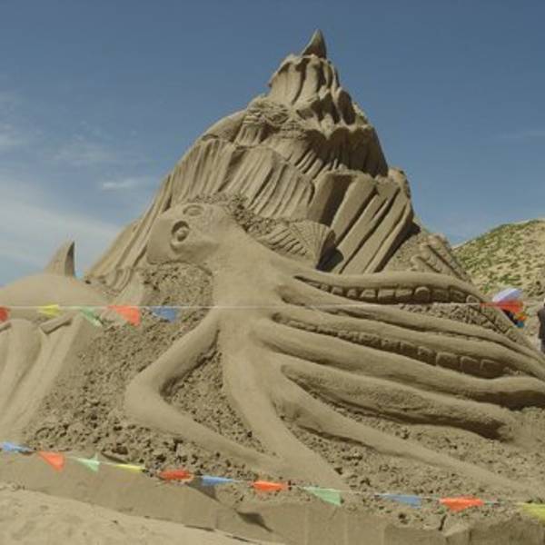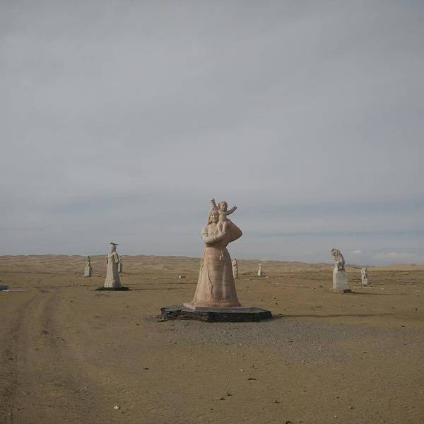 景区外围有一片昆仑文化雕塑园,修建了各式各样的昆仑神话传说的雕塑群。湖边不远还有一艘超大型海盗船,湖边稀疏的有些小亭供游人小憩、拍照。景区每年7月都会举行大型沙雕艺术节吸引游客参观,所以我们去的时候大型的沙雕依然矗立湖边。