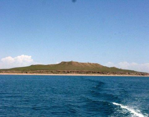 海心山,青海湖中心略偏南,距离鸟岛25公里。岛缘多为悬崖峭壁,岛上有清泉,有庙宇。赞。