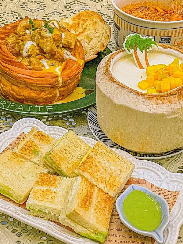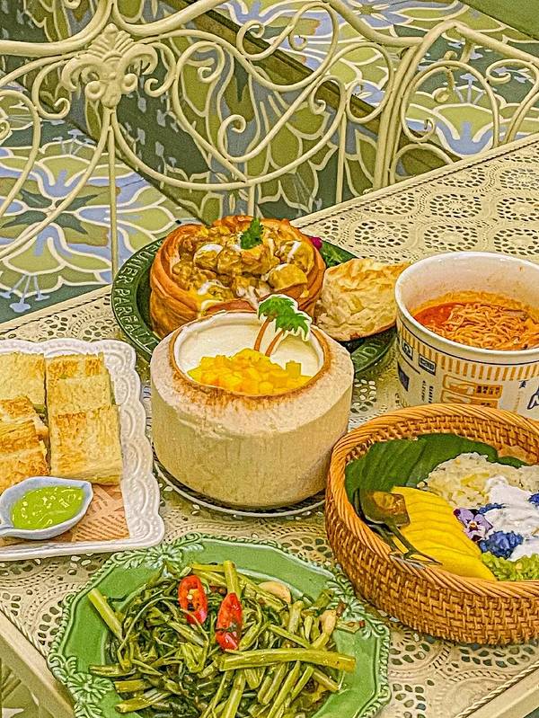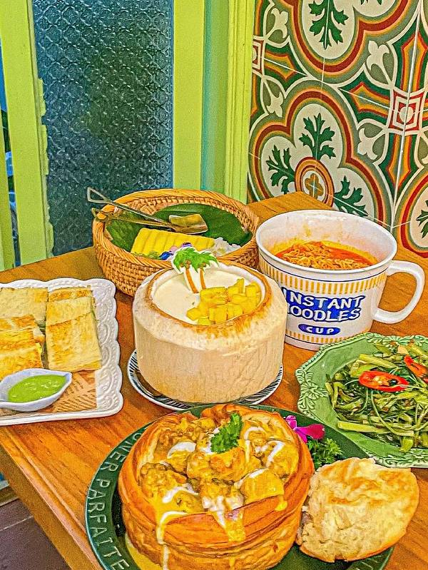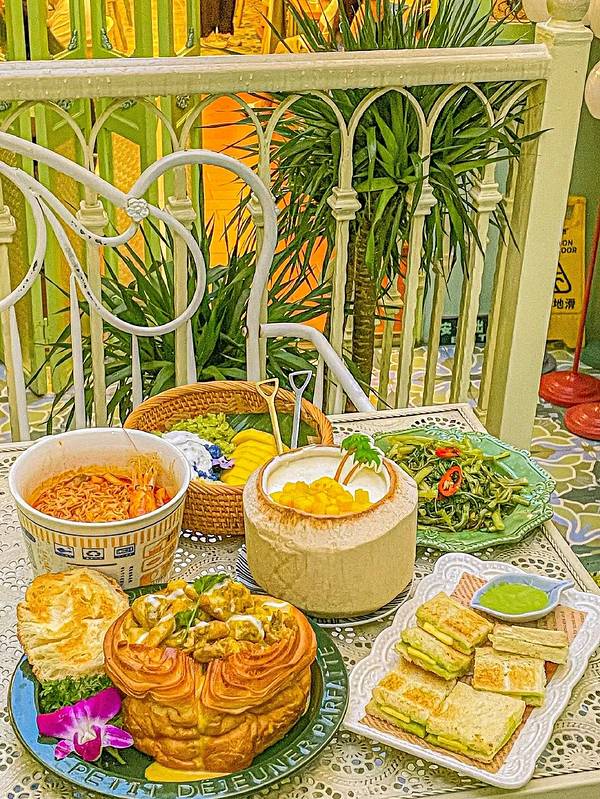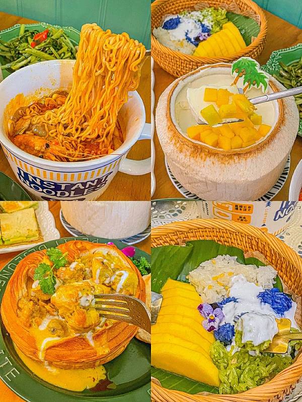 天呐‼️我是怎么挖到这家店的‼️颜值又高又巨巨巨好吃太惊喜了‼️ . 刚好赶上了二楼的桌子,一楼是红色色调,二楼是绿色色调,还有小花园,可以上楼顶,太美了‼️可是它不光美,各种菜都戳中了我的心巴‼️ ✅古法咖喱面包鸡 它家的鸡肉好新鲜, 咖喱味不会很重口是奶香奶香的, 真的是吃到停不下来‼️ ✅芒果糯米饭 🥥这饭超好吃, 尤其是淋上了椰奶后味道很香甜, 芒果肉也是切好的特新鲜‼️ ✅香兰叶冰露包 小点心香软香软的, 配合冰冰凉的酱口感很不错, 特别喜欢吃这个甜甜的小点心‼️ ✅冬阴功MAMA面 面真的好入味啊, 还有一些海鲜大虾真的不要太满足, 真对得起我在门口排那么久队‼️ ✅芒果椰奶冻 好吃到连最后的椰肉都刮下来吃了, 上面有芒果🥭, 能吃到3️⃣层口感,冰冰凉好清爽‼️ 真的好想再去吃一次‼️太好吃了我认真的‼️ . 👉嘎莉泰泰(北京路) ⏰11:30-14:00,17:00-21:30