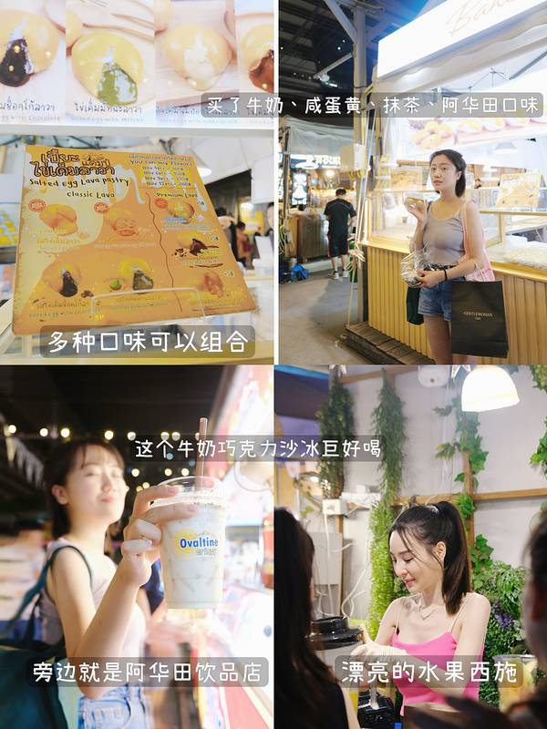晚饭后我们来了jodd fairs夜市! 营业时间:16:00-午夜 来曼谷之前就大闻其名,不过泰国朋友建议还是不要去那里吃东西,不是别的,因为本地人不太会去,价格会有点偏高! 我们晚饭后去遛弯,环境不是太好,就是很普通的夜市。 买了当地的小甜品和阿华田沙冰尝了一下~那个小甜品忘记叫什么,在阿华田饮品铺旁边,蛮吸睛的! 口感是糯糯的,里面加了馅儿,可以挑四个口味组一盒,我买了咸蛋黄、斑斓、牛奶和阿华田,挺甜的,不适合多吃! 阿华田的牛奶巧克力沙冰蛮好喝的,凉凉的,巧克力味贼浓!可以试试