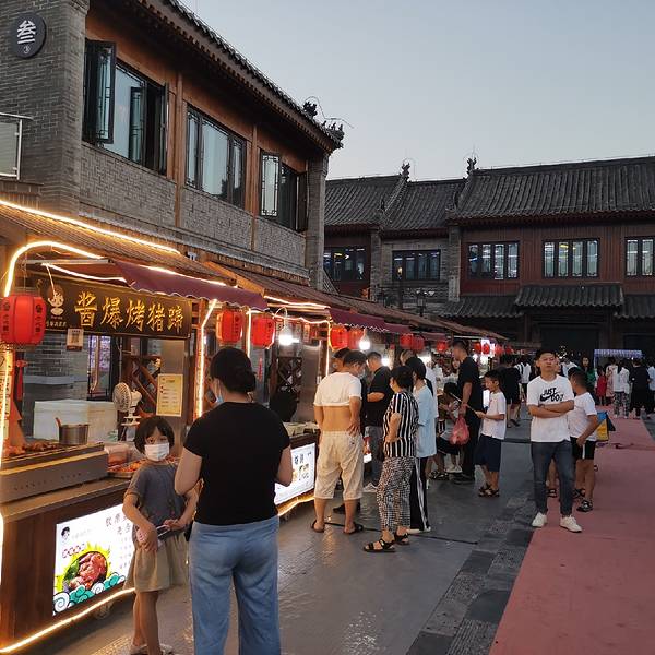 老菏泽的话当然是要来这个老城曹州旅游休闲区来逛啦,这里晚上有灯光,整体就是十分的热闹,而且这边有一些摊位都是卖一些文创啊之类的东西,我看晚上更多的是来溜娃的人,还有一些活动的老年人,整体是很热闹的...