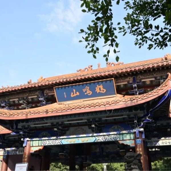 站在鹤鸣山景区的入口处,一股浓浓的古代建筑气息迎面扑来;向里面望去,路旁的树木郁郁葱葱;走到望江长廊,湛蓝的天空下,阳光照在长廊上熠熠生辉,周围的树木衬托出这里宁静的气氛;站在望江长廊上,看着无量宝塔就这样鹤立鸡群在环山之间,郁郁葱葱的树木丝毫掩盖不了它独特的气质;两只在树梢盘旋的野鹤雕像,更是为这里增添了一丝空灵的气息。