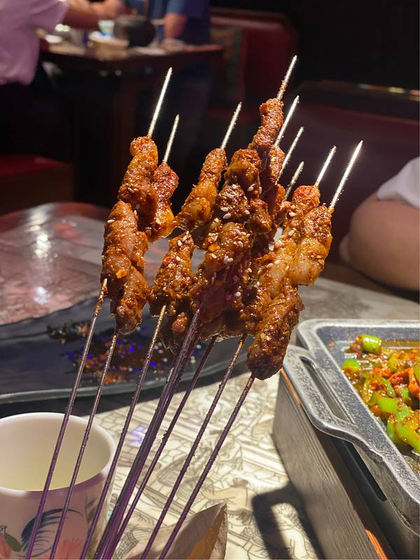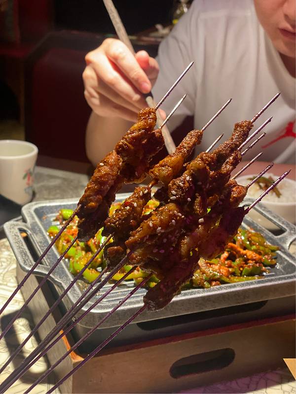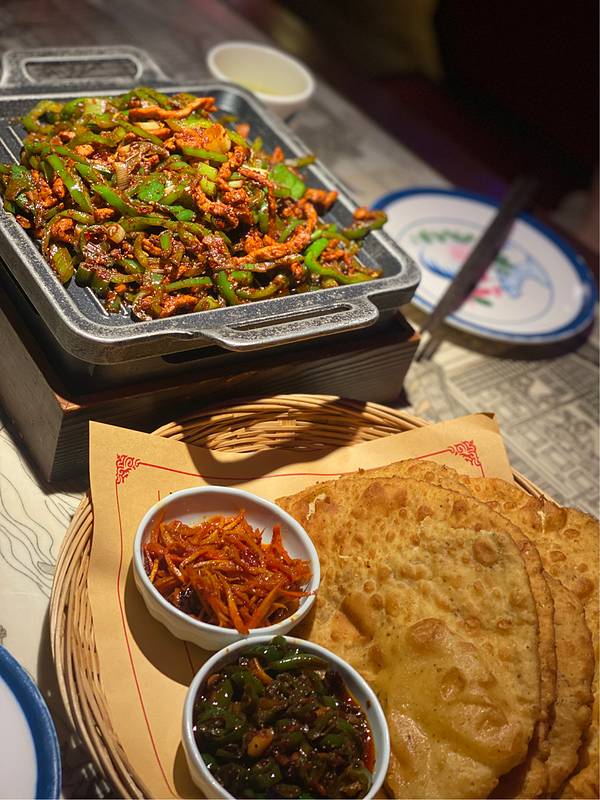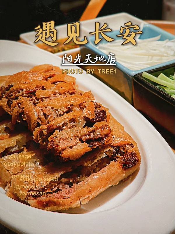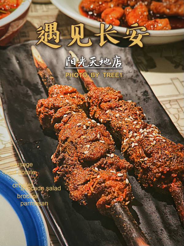 遇见长安出品很稳的连锁陕菜馆子 📍阳光天地3层,饭点需等位。店内装饰很有唐风韵味,晚上七点多舞台有表演,初到西安的朋友推荐感受下。落座扫码点单,摆盘基本都精致讲究。 脆皮肘子 遇见长安之必点菜,全场最佳,出餐摆盘讲究精致,小菜和蘸料搭配合适。食肉主义推荐,扬长避短的一道硬菜。吃起来没有猪肘的厚重油腻,表皮裹了淀粉炸制酥脆,内里肘子肉质软烂,有几种搭配的小菜可选,墙裂推荐蘸甜面酱卷饼,口感层次丰富,味道惊喜 老醋里脊 品控稳,里脊的面衣不算太厚,口感酥脆,调味上总体没有老醋的冲劲儿,酸甜味道还是比较温和,盘底收汁富余,可拌两碗米饭。 干拌牛肚 酸味辣味很带感的凉菜,调味适中,牛肚口感不韧不干。 红柳羊肉 大串羊肉吃着非常过瘾,肉质撒料火候都没什么挑剔,肥瘦比例合适,肉质细嫩。 💰人均四五十性价高。陕菜各种小吃硬菜烤肉都可以选择。