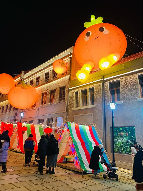 大鲍岛上街里,这个正月太热闹了,几乎天天都是不夜城,晚上去逛,超级好拍! 图1图2是太兴里,大红灯笼挂满整座里院,超有 春节气氛。 图3图4有星星市集的氛围感,小帐篷里可以拍照歇息避避风雪。 图5是青岛出名的苟不理包子店,就在街中央,里 面吃包子的人超多! 图6图7要强烈推荐,阿狸文创主题展,喜欢阿 狸的一定要来!