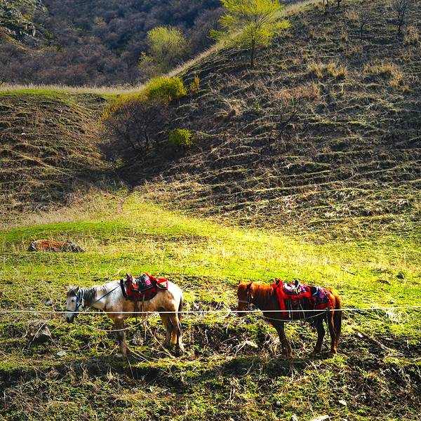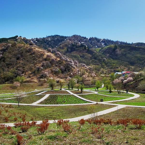 原计划吐尔根杏花沟是我们此行的重点景点之一,可在昨天的行程中,遇到去过的游客介绍,吐尔根杏花沟的杏花开的早,同时遇上前两天的风雪天气,已经全部凋谢,所以一直在纠结要不要去。入住酒店后老板建议我们去新开的景区吐尔根大峡谷看看,于是临时改变路线,去往吐尔根大峡谷。吐尔根大峡谷,确实是一个纯天然的新开的景区,去往的游客很少,一路上遇见的游客不超过30人,景区根本无设施可言,连大门都没有。。自驾车不能进去,可以在景区门口购票坐一段马车进入。下了马车后,要么花钱骑马继续往峡谷深处去,要么沿着峡谷步行进入。实在不敢骑马,我们选择在烈日下步行。峡谷两边山坡上倒是可见大片的杏花树,不过都是灰蒙蒙的,毫无色彩。脚下的路也不是步道,全是坑坑洼洼的土路,夹杂着马粪,体验感极差!走了约半小时,向从里面返回的游客打听前面的风景,得到的答案是跟眼前的毫无差别,果断的返回。乘坐的马车峡谷两侧的杏花休闲吃草的马从大峡谷出来,在大众点评上搜索附近的景点,看到伊犁植物园的宣传还不错,立即前往。伊犁植物园,位于新源县野果林改良场,貌似建在雪山下,面积很大,院内有杏树,梨树,桃树等很多树木,去的时候看到景区工作人员正在栽种各种花草。景区建设比较规范成熟,停车、休息都很方便,是一个不错的休闲娱乐赏景的好去处!杏花 雪山植物园植物园今晚继续宿新源县