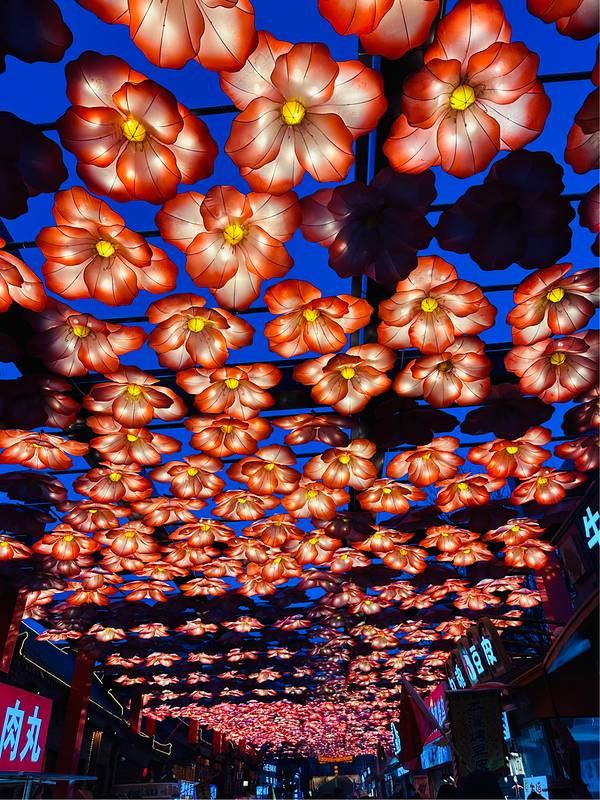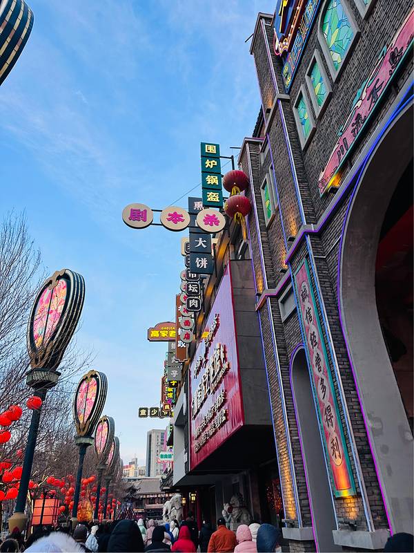 春节在沈阳过的,跟着家人来体验一下有名的老北市夜市。老北市夜市在北市场里,说是夜市,其实从下午5点多摊位就陆续出来了。由于客流量很大,老北市东门只能出不能进,我们跟着熙熙攘攘的人群👨👩👧👦,绕道从西边进入。 老北市有室内室外两个夜市区,都有很多摊位,吃喝玩乐购应有尽有,据说央视春晚就是在这里取外景。由于天气寒冷,我们先进了室内,室内说是民国风,但是却又有现代色彩,有上下两层,各种各样的小吃、小店和娱乐设施。由于太饿,先买了几大串肉串🍖解解馋,然后又在里面溜达了一个小时,开始转战室外。室外区域空间更大,几面大鼓🥁吸引很多游客用力的敲,好似想通过大鼓把一年不开心的事情赶走。我们目标明确,还是直奔美食区,各种小吃吃了个遍,吃的饱饱,心满意足。 老北市夜市可以说是超乎我的想象,灯红酒绿,很前卫也很美,各种色彩搭配非常适合打卡🤳出片,而且春节期间还有很多节目,不知道非节庆期间是什么样,但非常推荐来体验一番。