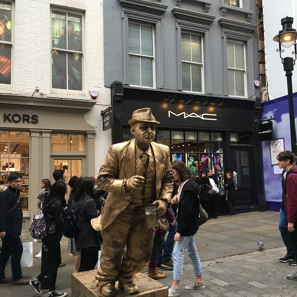重游伦敦还是要去看看考文特花园市场Covent Garden Market。旅行中每到一地,逛逛当地的MARKET,近距离了解当地人的生活状况,使旅行变得更加丰富多彩。逛考文特花园市场犹如北京逛庙会,那里有英国人的杂耍,免费看歌剧演唱,淘点喜欢的小玩意,吃点当地小吃,喝杯咖啡。市场很大,小半天时间很快就过去了。这次最吸引我的是行为艺术造型和以前不一样,含有高科技,悬空坐着或站着令人诧异。一样的是游客和当地不同种族的人群聚集,正赶上英国BANK HOLIDAY长周末假日中午,游人如织,室内外,楼上还是底层非常热闹。创意小商品和纪念品种类更多了,餐厅咖啡厅座无虚席。意大利餐食很受欢迎。有一年是草莓上市的时候,整个市场弥漫着草莓香味,人手一盒品尝香甜的草莓。演唱歌剧的,水平不低,和上次来的时候一样,增加了欢快和浪漫气氛。以前还赶上过音乐学院学生演奏表演。考文特花园里有好几个博物馆。交通博物馆最大,介绍伦敦交通的历史,现状,还有一些趣事。Covent Garden 地铁有一站,出站就到了。