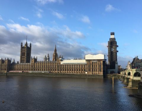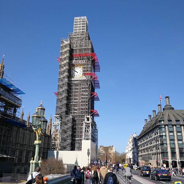 4月18日上午, 9点半钟离开酒店,跨过威斯敏斯特桥前往国会广场方向。虽然正赶上大本钟四年静音维修期,钟楼外围搭满了脚手架,但威斯敏斯特桥头还是拥挤着许多慕名而来者。
