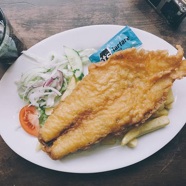 6、正统的fish and chips,必定是选取鳕鱼(cod&haddock)或是比目鱼(plaice),取去骨的肉段,裹上蛋奶面粉糊,用高火油炸。