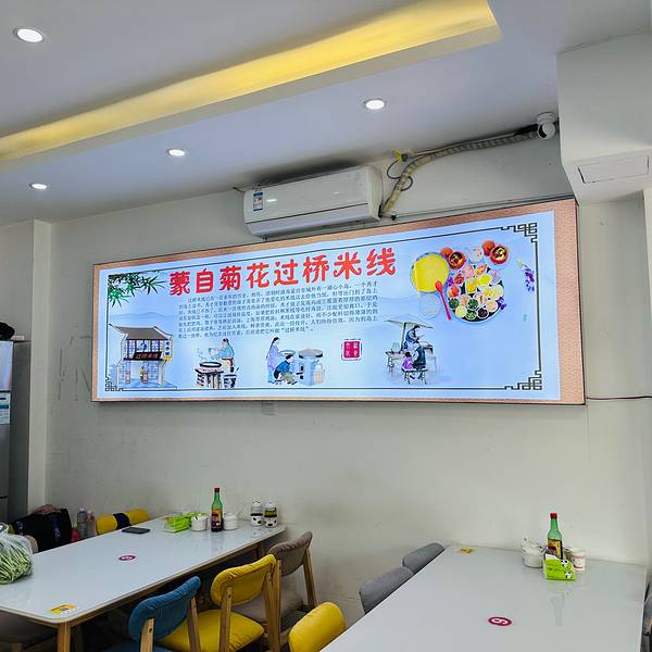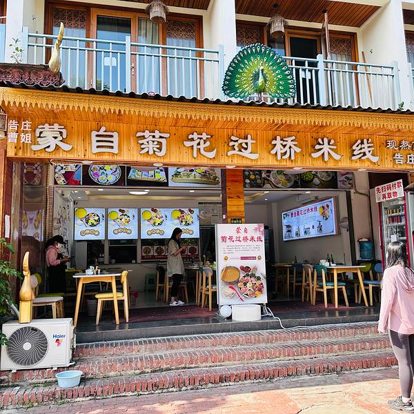 落地西双版纳就想着先吃碗本地特色过桥米线🍜,这家米线店就在酒店🏨附近,于是我们一行人酒店安顿好之后就直奔这里。 🍃环境: 到这里的时候过了高峰点,因此店里并没有客人。店面收拾的很干净,两侧墙壁一侧画着壁画一侧用灯箱呈现了“过桥米线”的历史传说。正面是店里的四款米线套餐和特色菜品的图片,每一款套餐里都很丰富,价格也阶地性增高,从38到100多不等。套餐起的名字也很有意思,云南印象、星桥火树、食过味迁、词不达意。我们选了2小1大三份套餐,又单点了一些菜品。 🍴味道: 上菜很快,米线入汤,把喜欢的小菜倒进去,趁热开吃。米线软糯,口感不错,搭配的小菜也很合胃口,热乎乎的汤进肚,一下就驱散了旅程✈️的疲惫。整个套餐份量还是很充足的,我们四个人吃的饱饱,西双版纳第一站还算满意。 📍位置&交通 这家店地处告庒西双景的核心区域,离星光夜市非常近,住在告庒西双景里的游客步行🚶🚶♀️即可达到。