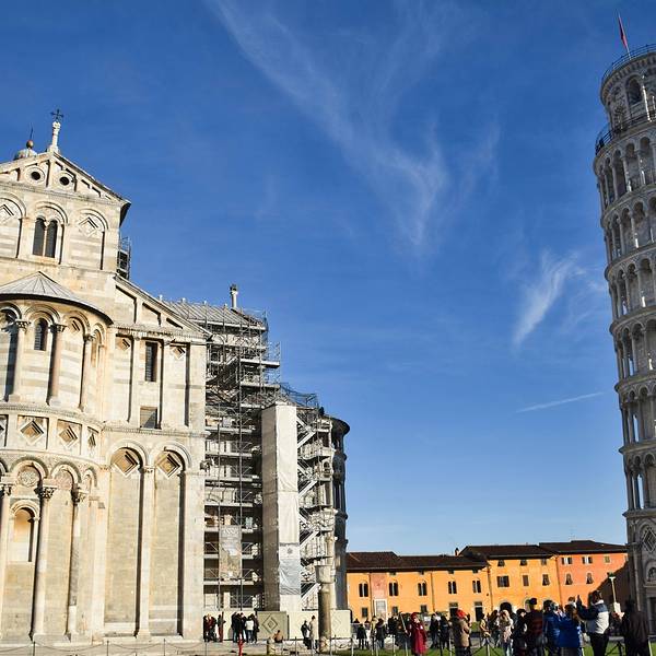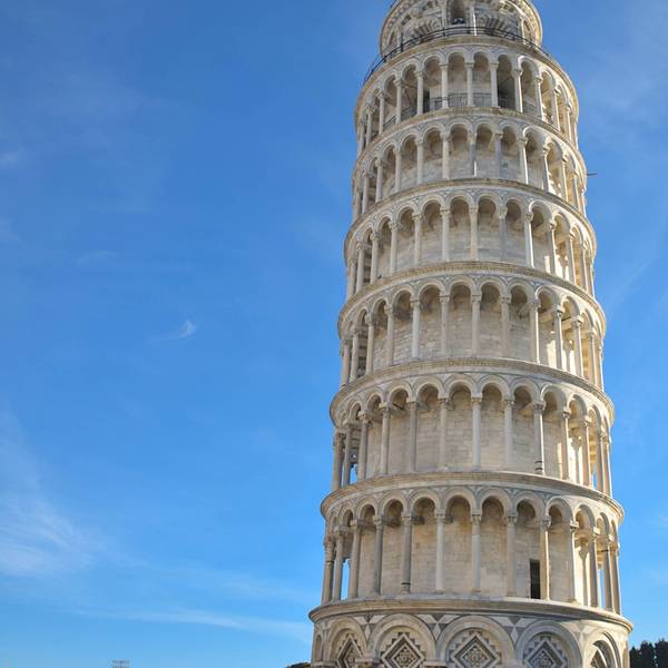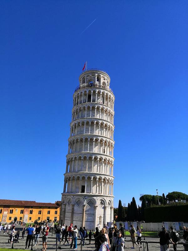比萨斜塔是意大利的标志性建筑,更是世界建筑史上的一大奇迹,被联合国教育科学文化组织评选为世界文化遗产。比萨斜塔其实是比萨大教堂(CathedralofPisa)的一座独立钟楼,位于比萨的中央广场——奇迹广场。广场上到处都是人,常见的就是游客们伸出胳膊,摆出各种奇思妙想的造型与斜塔合影。斜塔建造历史与倾斜原因比萨斜塔离大教堂20多米,外观呈圆柱形,由白色大理石砌成。在塔基上用拉丁文刻的始建年为1174年,于1350年竣工;但实际上比萨古时所使用的历法比公历早一年,所以比萨斜塔的始建年为1173年。据说比萨斜塔是用比萨舰队运来的六艘战利品建成的。比萨斜塔高54.5米,直径16米,塔身向东南方向倾斜,倾斜的角度约为3.9。在建造初期,斜塔平均每年倾斜1毫米,也曾一度停工。大部分人相信是由于地基不均匀和土层松软而倾斜。1998年,工人们在第三层上裹上电缆,将其附在框架上,并移走了北面的一些沉积的土壤,使斜塔处于平衡的状态。登斜塔俯瞰比萨城,斜塔每层都有拱门,总共有213个,塔底层的墙壁上刻有浮雕,顶层有钟亭。塔内有螺旋台阶294级,供游人登塔,远眺全城风光。有些台阶比较滑,需要留意脚下。夏季的晚上可以在斜塔欣赏美丽的比萨城夜景。进入斜塔的体验很特别,顺着非常窄的螺旋梯走的时候,竟会有仿佛在船上的错觉,到达塔顶后,视野豁然开朗。塔顶有玻璃,因为塔的内部是空心的,因此透过玻璃可以直接看到底层。登塔流程现在登顶斜塔有时间和人数的限制,需要提前去售票处预约购票,或者如果想要避开排队长龙,可以现在官网购票,打印出来。登顶持票者应提前在指定地点集合,工作人员会先用5分钟时间介绍斜塔的历史,然后才由专人带队登塔。每批只安排15人,在塔上的停留时间不得超过30分钟。周围景点如果觉得斜塔票价太贵,也可以就在斜塔周围转转,或者参观广场上的教堂和博物馆。景区附近有多条步行街,小店里出售各种手工工艺品。