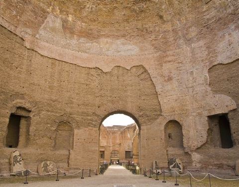 卡拉卡拉浴场是卡拉卡拉国王(Caracalla)于公元217年下令建成的,以花岗岩砌成,整体装饰繁复纷杂,尽显繁华的古罗马奢靡之风。浴场占地10公顷,每次可接纳1500人同时享受洗浴的乐趣。浴场周边与当时意大利的其他浴场一样,这里当年也是坐落在草长莺飞、景色一片秀丽的花园里。不同寻常的是围墙的一侧有一间长38米、宽22米的图书室。图书室的内墙上嵌有32个用以存放卷轴的书橱。内墙前砌有一条长凳,这样人们就可舒适地坐在长凳上从书橱里找书来读。图书室边上有通往浴场的台阶,供人们在饱览诗书之余闲庭信步至浴场,转移注意力,梳理情绪。除了图书室,浴场边上还有与热爱体育的罗马人生活息息相关的体育场,因为来客众多所以各种商店也是必不可少的。浴场兴与衰浴场开放了3个世纪后,在一次罗马围困中,这里的供水管道被哥特人切断,自那时起浴场就淡出了罗马人的生活。加上这里偏离古罗马市中心,丧失使用功能的它,很快就落入被人遗忘、一片荒芜的悲惨境地。中世纪的时候它很可能作为信徒的墓地使用。12世纪后浴场废墟成了建筑商们的采石场。