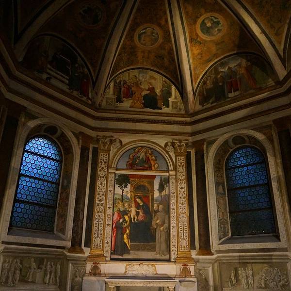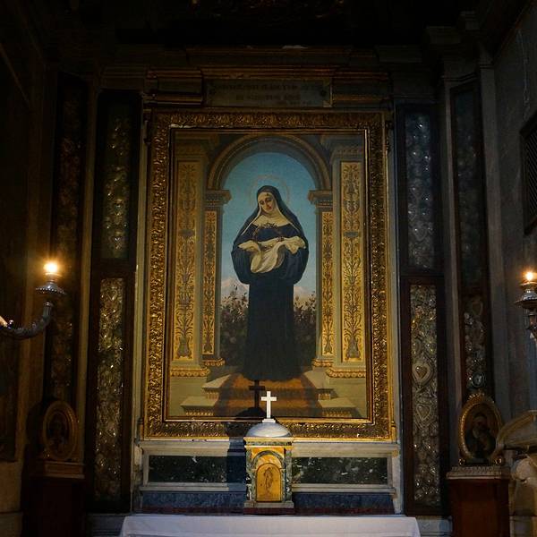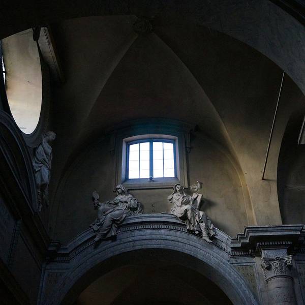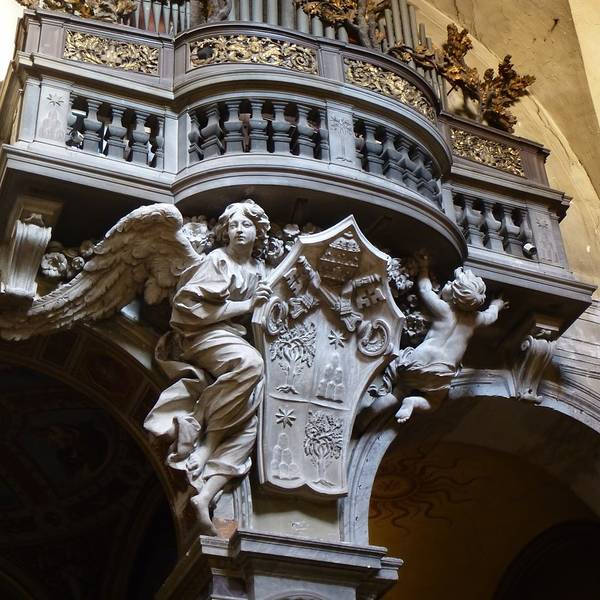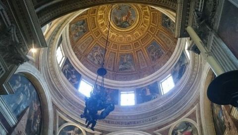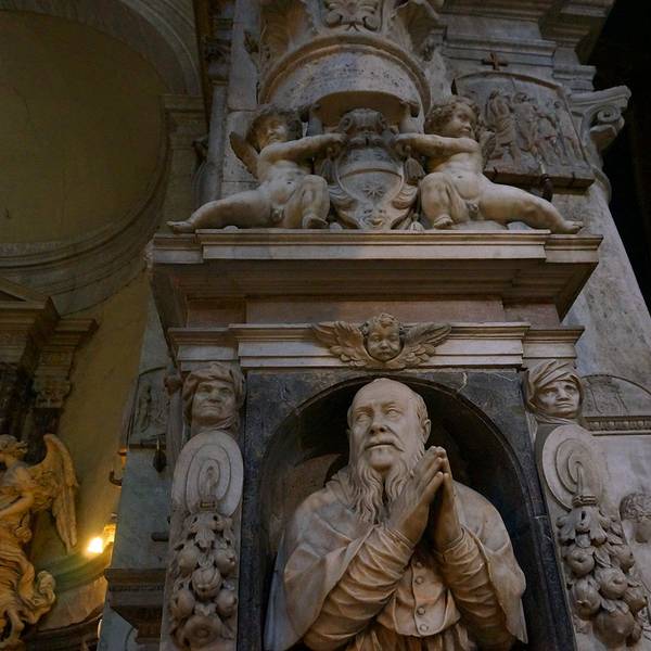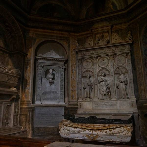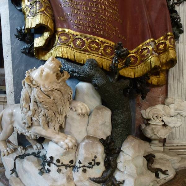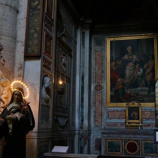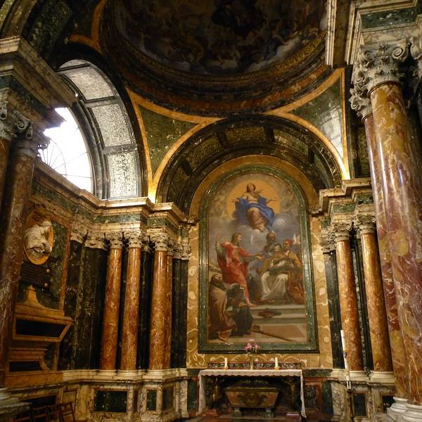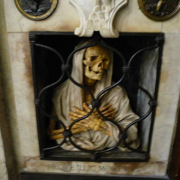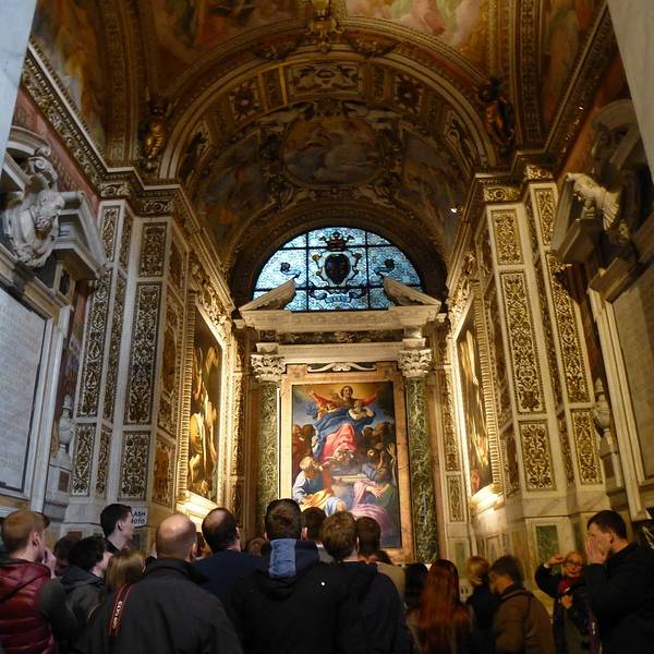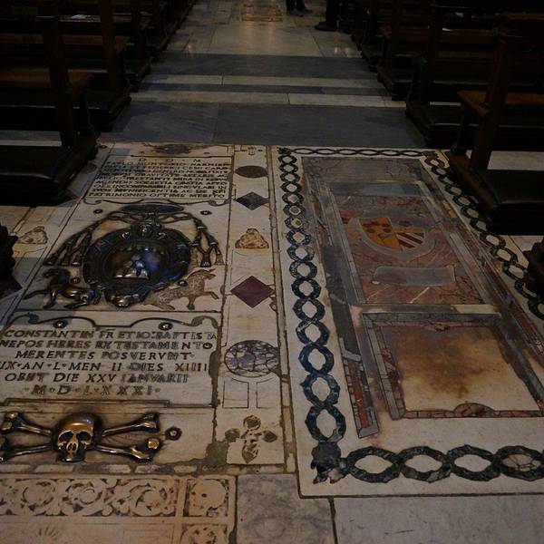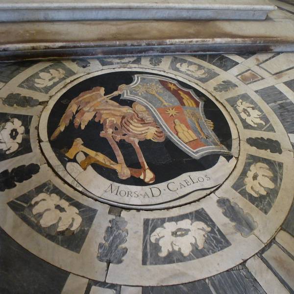 著名的镶嵌画——”下跪的骷髅“,小说”天使与魔鬼“当中也提到过的,在拉斐尔的基奇礼拜堂(Cap...艺术品宝库的人民圣母玛利亚教堂(Santa Maria del Popolo)