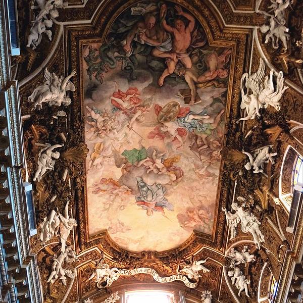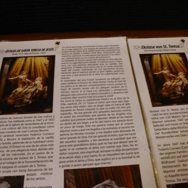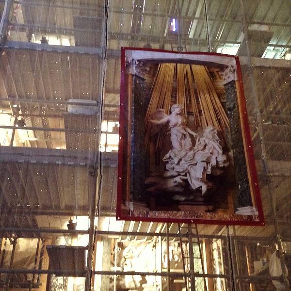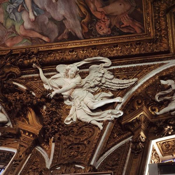 这座教堂里面,有西方美术史上洛可可雕塑最著名的代表作,贝尼尼的“圣特列萨的神迷”Ecstasy of St. Teresa。特列萨是个中世纪的修女,她梦见在天堂射下的神圣金光照耀下,天使用金箭刺入她的心脏。写得清清楚楚的开放时间一进门先看到脚手架,我的心顿时一凉~~喵的不是那最重要的在维修吧~~凑近一看,果然维修得比许愿泉还要彻底,透过脚手架根本看不清雕像的本身啊。算了,只能用一张拍得模模糊糊的介绍凑数不过呢,就算没有贝大师的杰作,这胜利圣母教堂还是很有看头的,真的是想都想象不到的金碧辉煌简直要亮瞎眼。我看得眼花缭乱,恨不能化身摄录机把这一点一滴的美貌装饰都拍下来。哎,回渥村就看不到那么漂亮的地方了肿么办,好忧伤