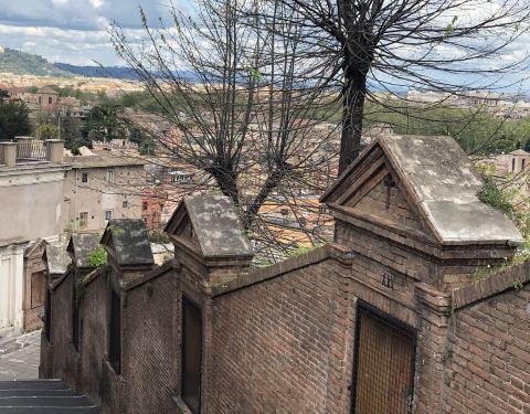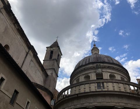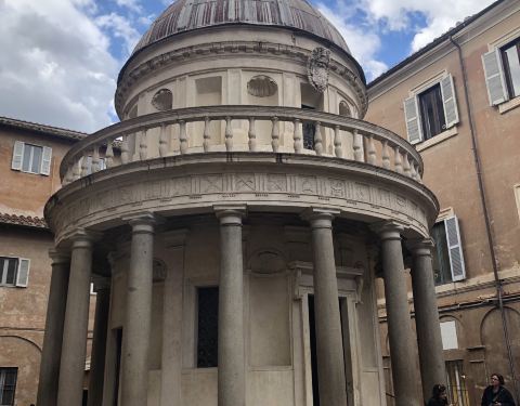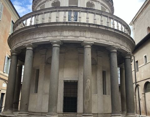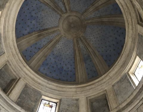 罗马胡同之旅的景点之一,就在半山腰上,旅客非常好,免费入内参观回廊和修道院~ 布拉曼特是个很牛逼的人物,具体请度娘,我也是看到介绍才对他有所了解,绝对涨姿势❗️ 修道院本身不大,这个穹顶是不是似曾相识呢,佛罗伦萨的圣母百花大教堂,万神殿都是这一款式,它的名气虽然小很多,不过小巧精致,别有一番风味,据说这是建筑系学生都需要来打卡,膜拜的建筑之一噢!