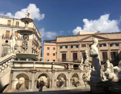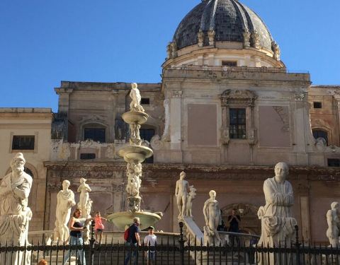 喷泉所在的位置是整个巴勒莫的核心地区。附近有精美的教堂,有阿拉伯特色的教堂,有四角广场,周边传世古老的建筑,在这附近闲坐都觉得很有味道。