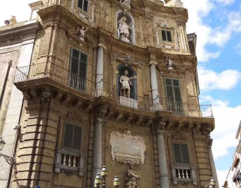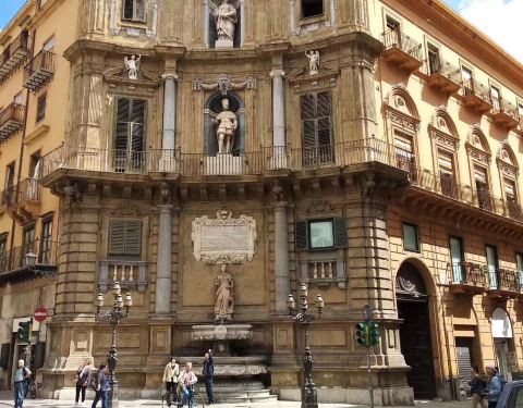 巴勒莫四拐角广场实属两大街道交汇之地。游客们叫这里是四角场景点。四角场其引人入胜之处在于四拐角之弧形建筑,彼此相对之立面对称,造型无异,层高一致,寓意相同,故遂成地标,终令居民意惹情牵,让游人魂驰梦想。