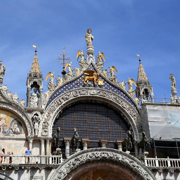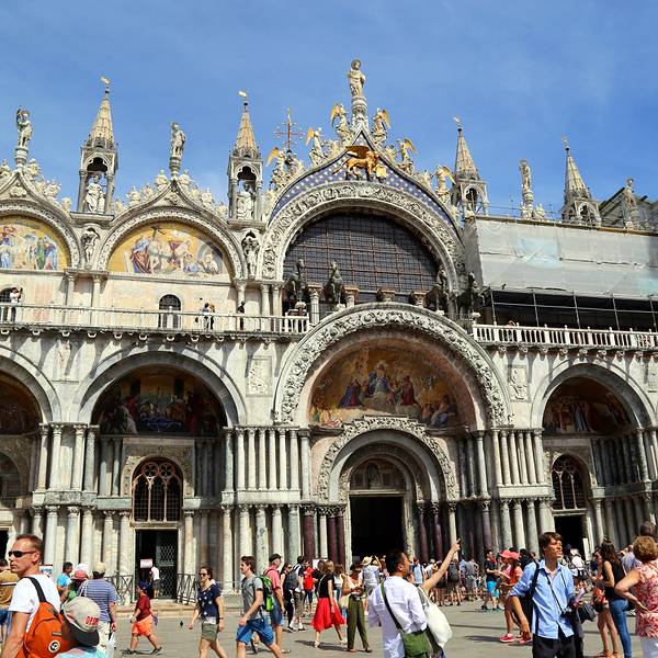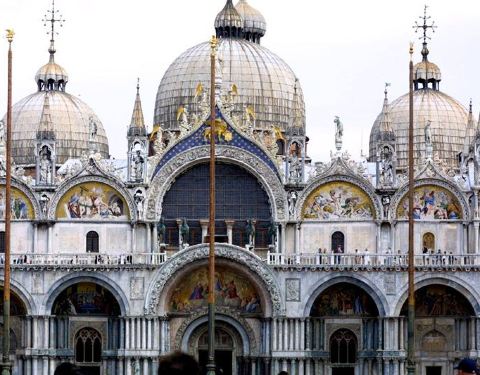 圣马可大教堂位于圣马可广场,与总督宫毗连。大教堂建于828年,因火灾在11世纪重建,起初只是用来安放圣马可的遗骸,其后用来收藏东征时期从各国掠夺回来的宝物。它曾是中世纪欧洲较大的教堂,是一座收藏丰富艺术品的宝库。 教堂以拜占庭风格为主,揉合了从罗马式到文艺复兴式的各种建筑和装饰风格,正面有五座菱拱形的罗马式大门,顶部立有东方式与哥特式尖塔及各种大理石塑像、浮雕对花形图案,巨大的圆顶和灿烂的镶嵌画是它突出的特点。 教堂由五个巨大的圆顶主厅和两个回廊式的前厅所组成,形成一个巨型的希腊十字架。五座圆顶仿自土耳其伊斯坦堡的圣索非亚大教堂,是与它齐名的拜占庭风格的建筑。教堂前矗立的三根旗杆有其特殊意义,代表威尼斯国威鼎盛时所拥有Cyprus、Crete和Morea三个岛屿,是该城辉煌历史的见证。 教堂正中顶部有一座手持《马可福音》的圣马可像,下方有象征圣马可的飞狮。