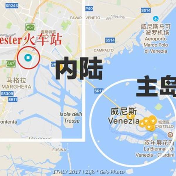 不得不说这一天的威尼斯之行会令我一辈子记忆犹新。因为恰好赶上威尼斯的双年展和电影节,又是度假旺季,整个威尼斯住宿价格飞涨。所以我们的酒店没有订在本岛,而是选择了内陆。红色的圈位置就是我们酒店的位置,距离内陆地区mester火车站步行300米左右。只要坐火车单程票1.25欧元/人,15分钟左右就可以到达威尼斯主岛火车站Santa Lucia,非常方便。