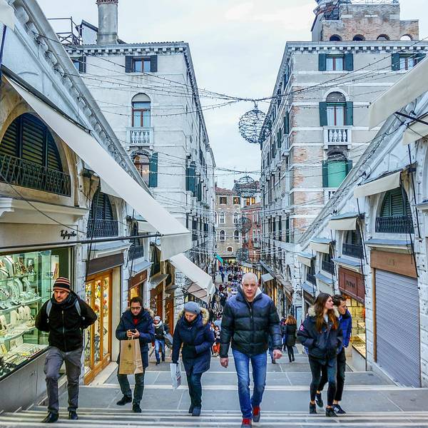 所以只有在有水的地方,才能体会出水上威尼斯的感觉。穿过了威尼斯主导的最中心,我们到了里亚托桥。里亚托桥是威尼斯四座横跨大运河的桥梁之一,也是最古老的一座,被称为“白色巨象”。过了这座桥就到了威尼斯最热闹的圣马可区,所以这座桥上的人也是格外的多。运河两旁都是各种咖啡馆和餐厅,所说可以欣赏到运河的美景,但这些饭店真的是为游客而开,以赚钱为第一目的,毫无性价比可言。当然即使是这样,每家店也都是人满为患的状态。里亚托桥上拍运河,应该是每个游客的相机里都必有得一张照片了。过了桥继续往圣马可广场走,每条小路上都是各种各样的商店了。纪念品店最多,还有日常欧美品牌的服装店,箱包店鞋店。