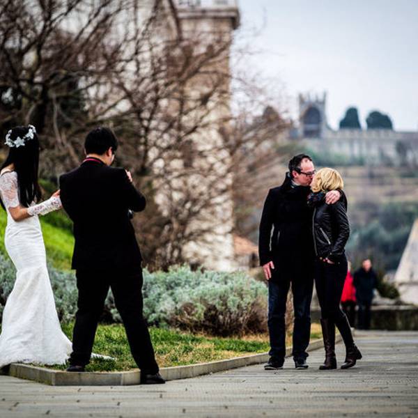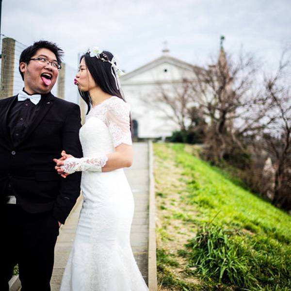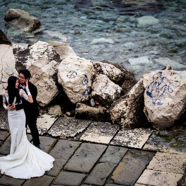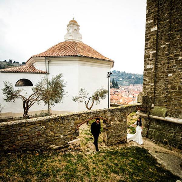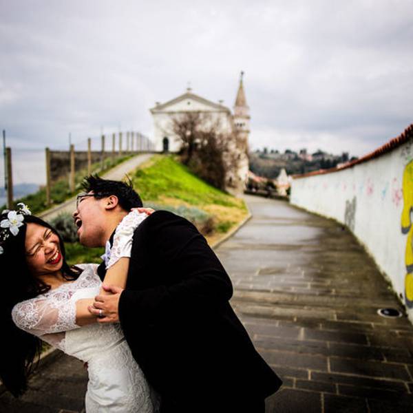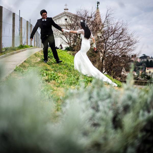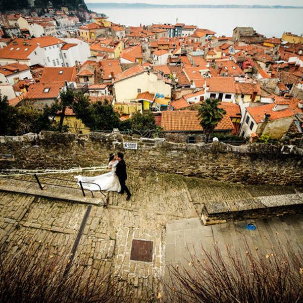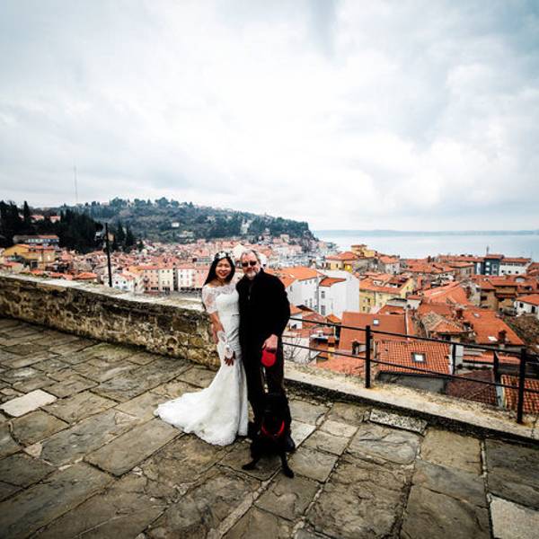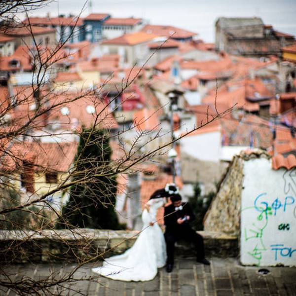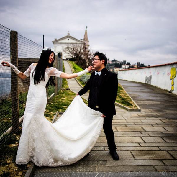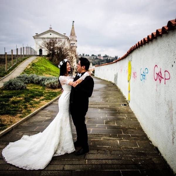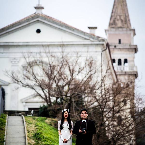 穿着婚纱礼服的我们自然而然地成为了游客们驻足观看的对象。别松手啊,否则有你好看的皮兰位于斯洛文尼亚的最北端的海岸,清澈见底的海水让它在夏天时为了欧洲人避暑的热门选择。圣乔治教堂可以俯览皮兰小镇。很喜欢它们的红色瓦顶。正如老婆所说,这次旅途有太多意想不到的事情。她根本没想过自己...皮兰位于斯洛文尼亚的最北端的海岸,清澈见底的海水让它在夏天时为了欧洲人避暑的热门选择。圣乔治教堂可以俯览皮兰小镇。很喜欢它们的红色瓦顶。正如老婆所说,这次旅途有太多意想不到的事情。她根本没想过自己能在海外的西式教堂前收获一组属于我们两人的婚纱照。从圣乔治教堂的另一端小路上山,游客并不多,即使没有暖暖的阳光,但阴天的云朵依然出彩。穿着婚纱礼服的我们自然而然地成为了游客们驻足观看的对象。这对来自匈牙利的情侣也不例外。他们也大方地满足了大伙的要求,让我用他们的手机帮他们记录下他们在教堂外拥吻的画面。吸血鬼上身斯洛文尼亚人都很喜欢小狗,大家早上都喜欢带着它们出来散步。噫,是不是跌东西了...老婆一边说害怕一边坚持要跟小狗合照。还好,小狗很听主人的指挥,乖乖地坐在地上。拉我一把啊,老公。别松手啊,否则有你好看的!!!看我的如来神掌相比站在镜头前摆姿势,我更喜欢站在镜头后捕捉。你看,我忍不住撇下老婆,自己拿起相机拍了起来了。为了能在镜头前露出最真挚自然的笑容,那天早上我估计说了不少冷笑话了吧,比当地气温还要冷的冷笑话,呵呵。不懂在镜头前如何是好我自己最喜欢的一张婚纱照。从来没有像这张照片那样伟岸了 :-)其实婚纱是借来的,由于想给老婆一个惊喜,所以想方设法去套取她的三围数字来估量婚纱是否合身。幸好老婆超爱这套鱼尾的婚纱,在这里我也要多谢这婚纱的主人毛毛,假如没有你的相助,这次秘密婚纱之旅也不会成行了,谢谢。忙里偷闲,我赶紧在教堂的背后俯拍了一张皮兰的海岸线不期而遇 展开